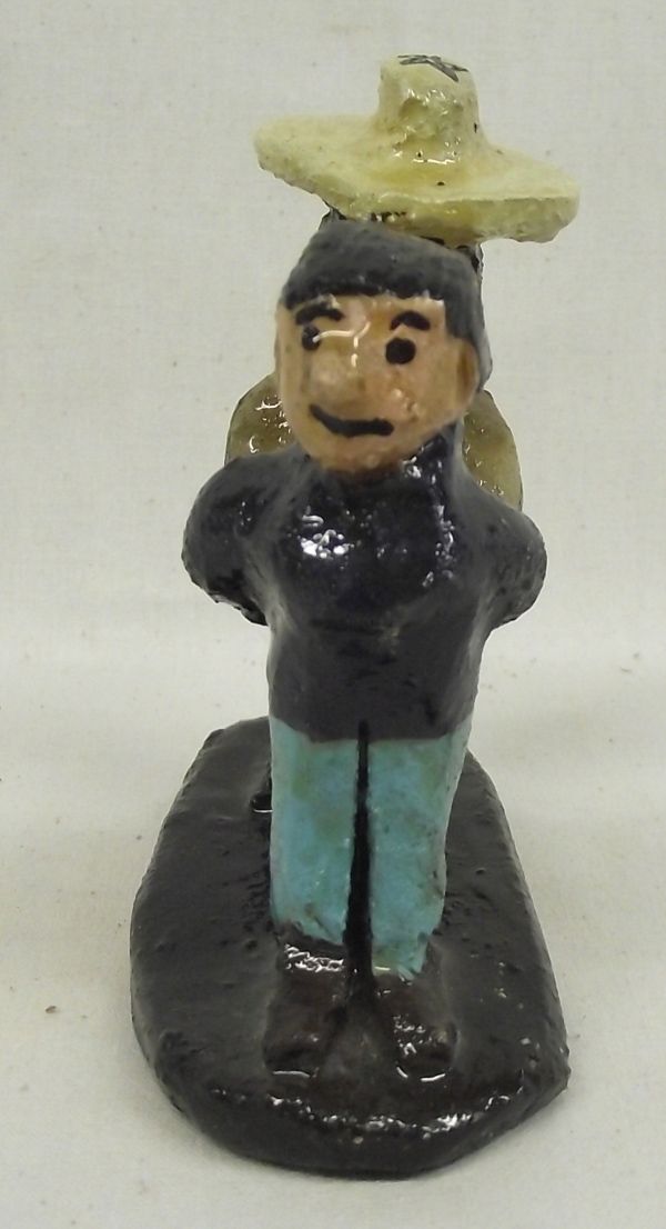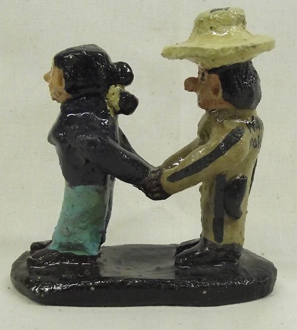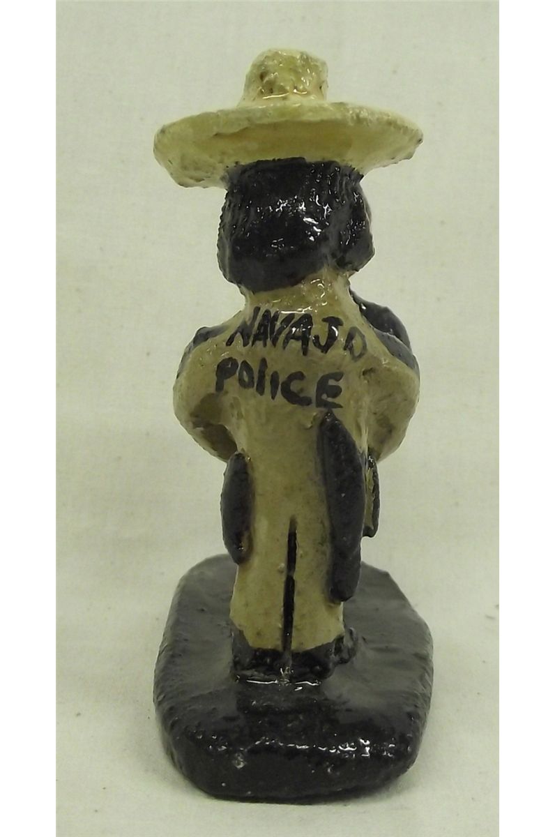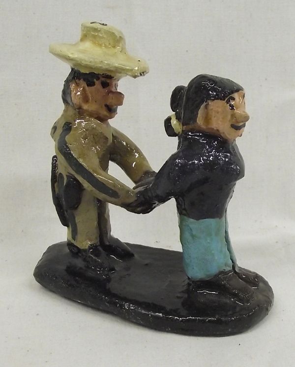 Navajo Folk Art Pottery Figurine - Jonathan Chee. Comical piece of folk art, a police officer arresting a woman, appears to be putting handcuffs on her. Signed ''JC'' on the bottom, measures 3 1/4'' x 3 1/4'' x 1 1/2''.