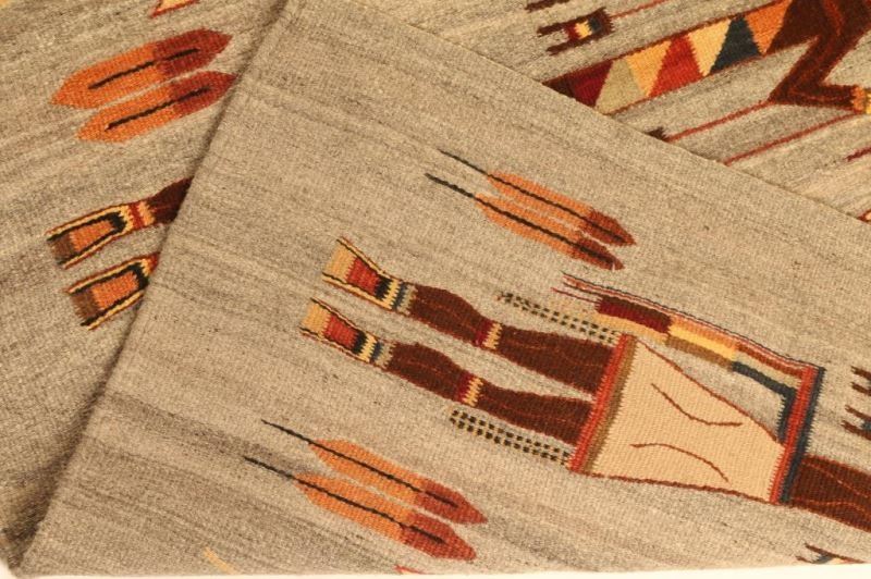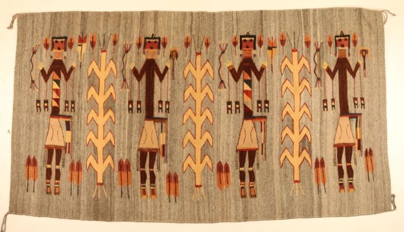 Gray Base with natural colored used in the figures and the maize motif, very finely done, in excellent overall condition measures 73"x40".