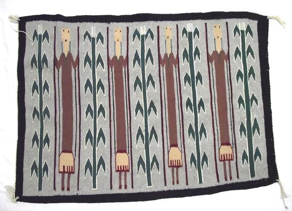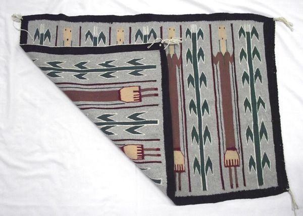 Navajo Four Yei Corn Stalk Wool Rug, measures approx. 31''W x 46.5''L. Five Green Corn Stalks with Four Yei Figures. Crisp, Clean Colors. All Tassles in tact, no tears, no stains.
