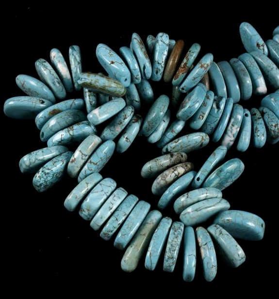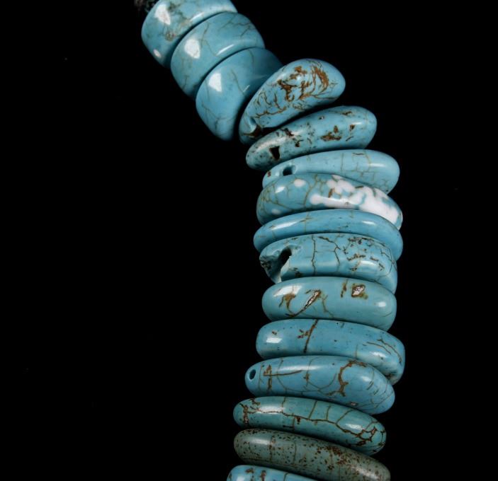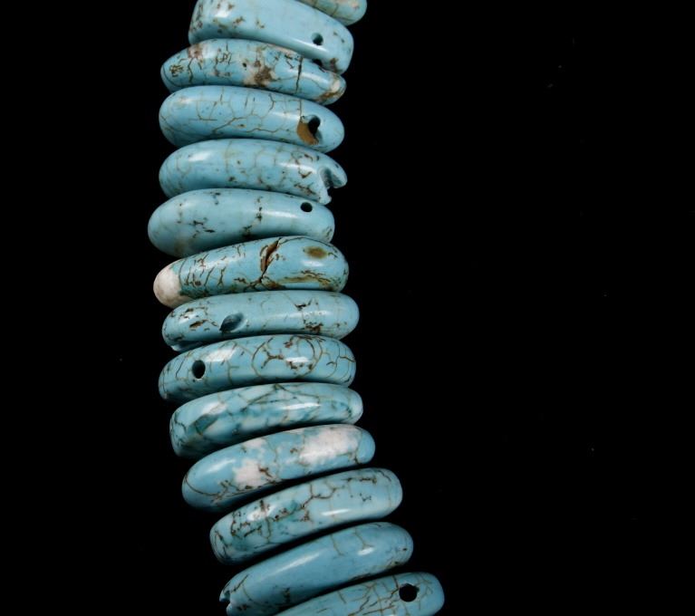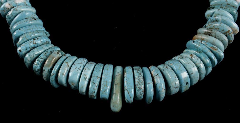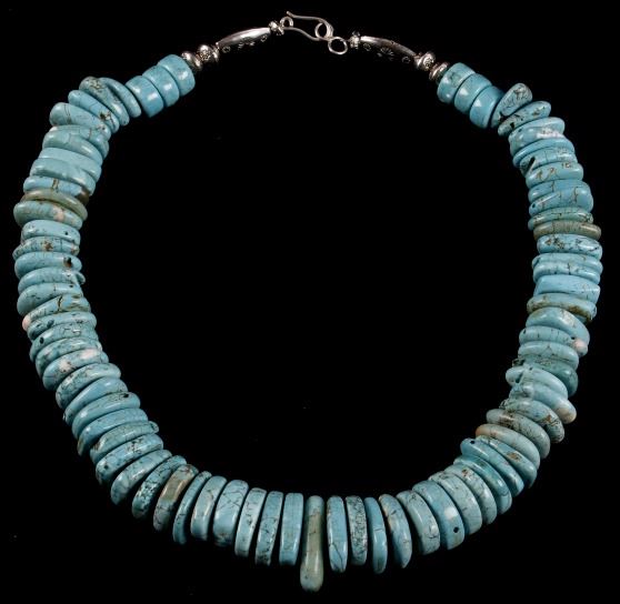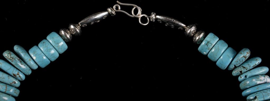 Included in this lot is a Navajo Native American Indian choker necklace, composed of 79 tear drop, and cylinder beads of Fox turquoise. The turquoise shows a light powder blue color, with a white/brown matrix. The necklace is finished off with decorative silver colored beads on each end. The necklace shows good condition overall, though there are few chipped pieces, and many beads have been re-drilled. The necklace measures 21 5/8" long.