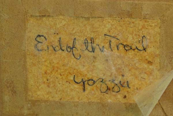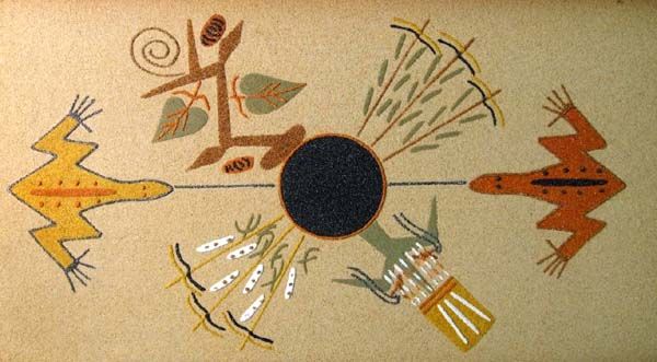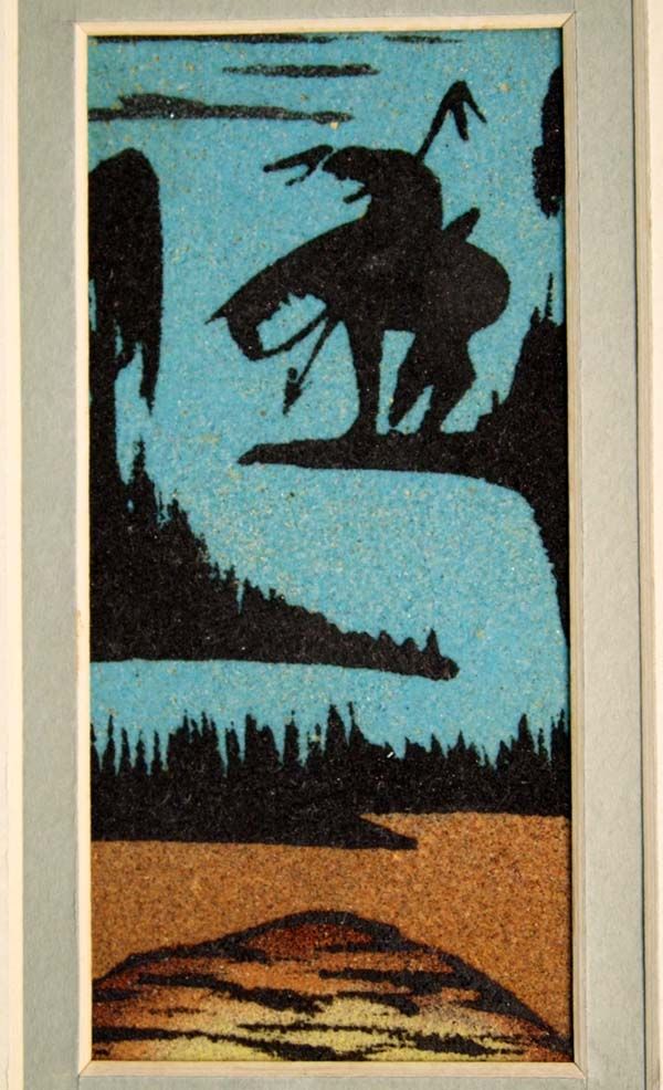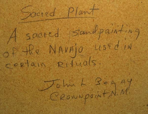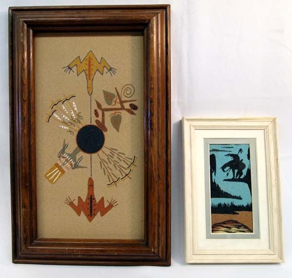 Native American Navajo Two Framed Sand Paintings. The large sand painting is in a wood frame. On the back is written: ''Sacred Plant''. A sacred sandpainting of the Navajo used in certain rituals. John Begay Crownpoint, N.M.'' Inside the frame measures 12.5''Hx6.5''W. The other painting has written on the back, ''End of the Trail Yazzie''.