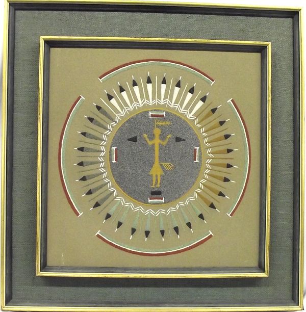 Navajo Framed and Matted Sand Painting, measures 17'' x 18'', Navajo Sandpaintings, also called dry paintings, are called ''places where the gods come and go'' in the Navajo language. They are used in curing ceremonies in which the gods' help is requested for harvests and healing.