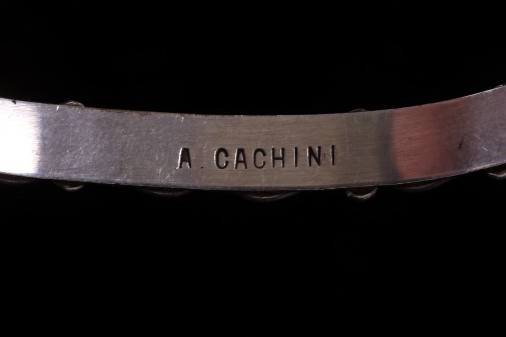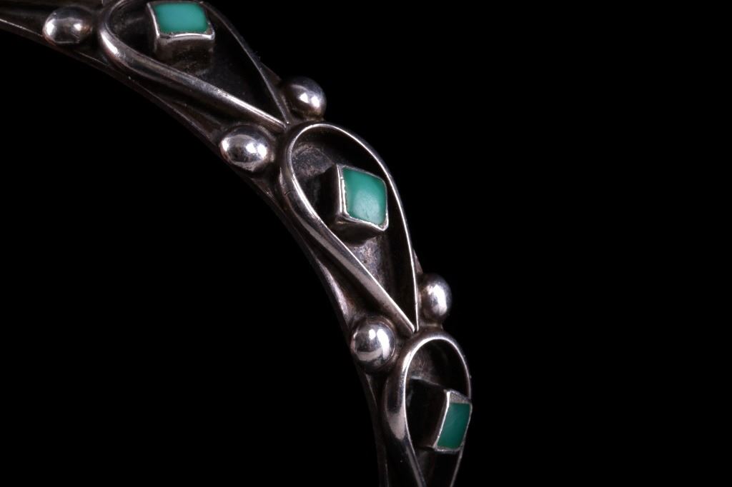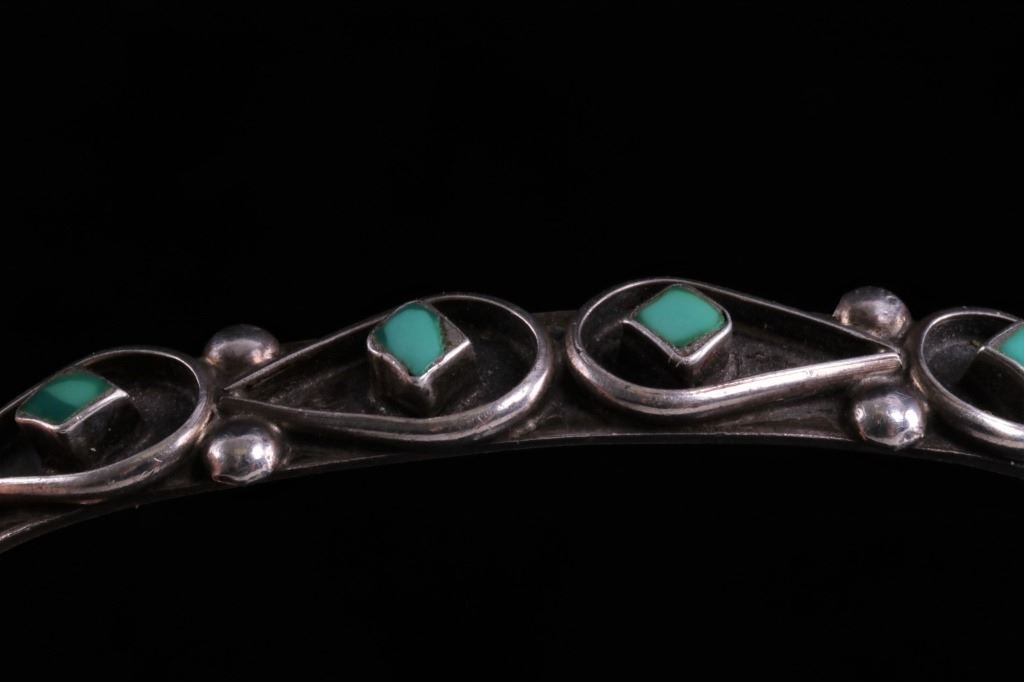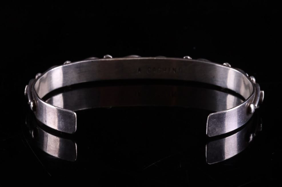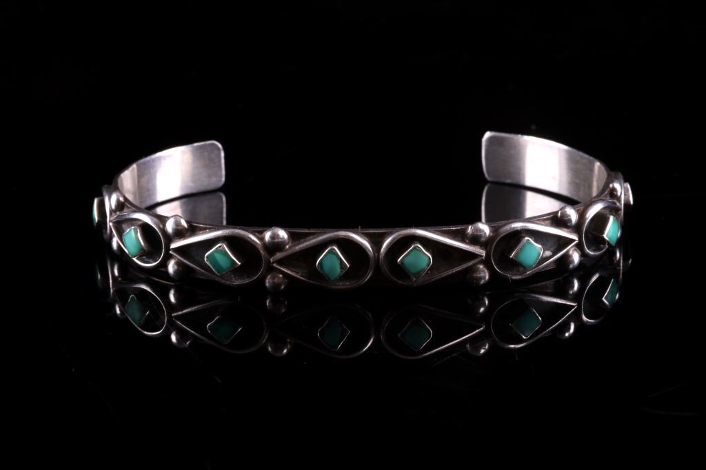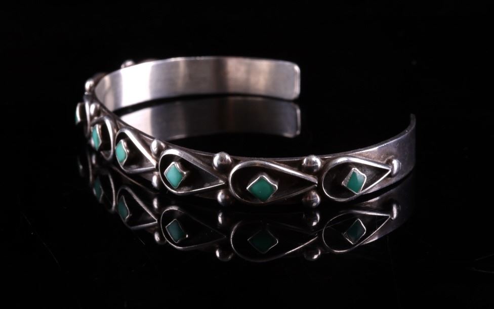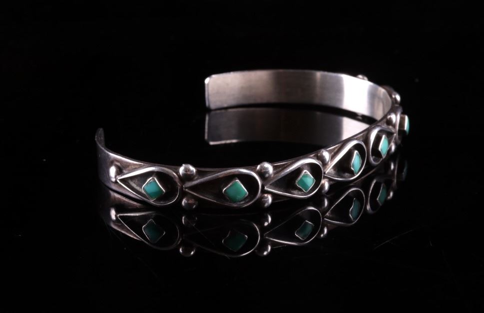 Featured in this lot is this sterling silver and turquoise bracelet from Navajo artist Fred Cachini; this bracelet resembles work consistent with the 1950's and 60's. This bracelet shows a wonderful design of tooled embossed teardrop design to the frame with inlaid filled turquoise marquise shaped stones. The condition of this bracelet is good, with no obvious signs of damage. The measurements of this bracelet are 1 3/4" x 2 5/8" x 1/4" with a circumference of 4 1/4". The weight of this bracelet is 13g.
