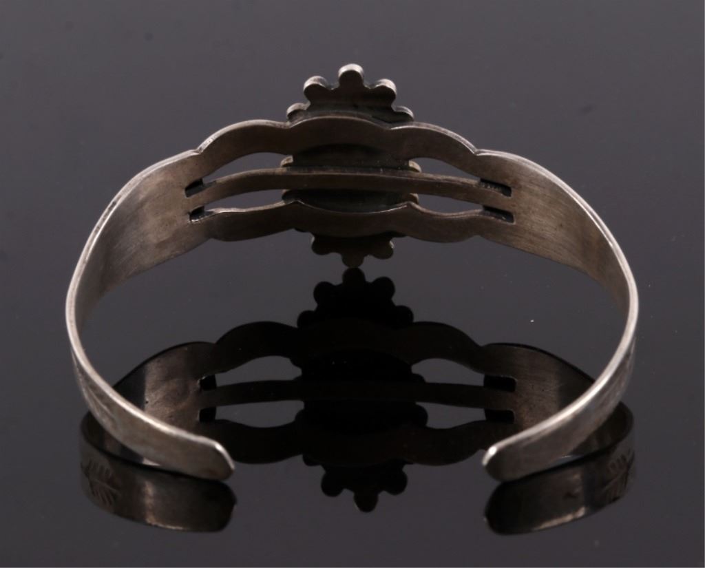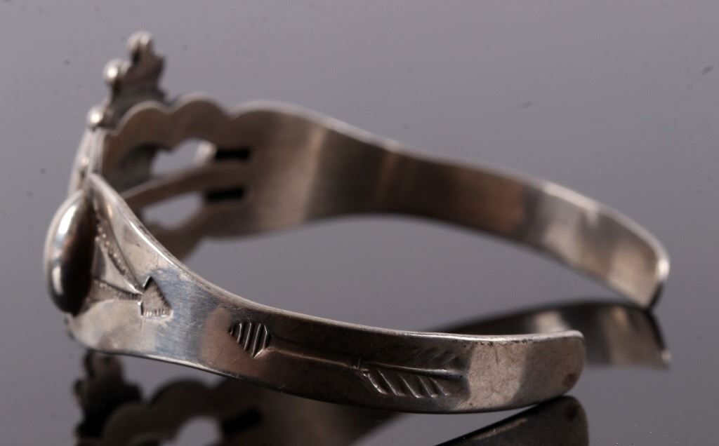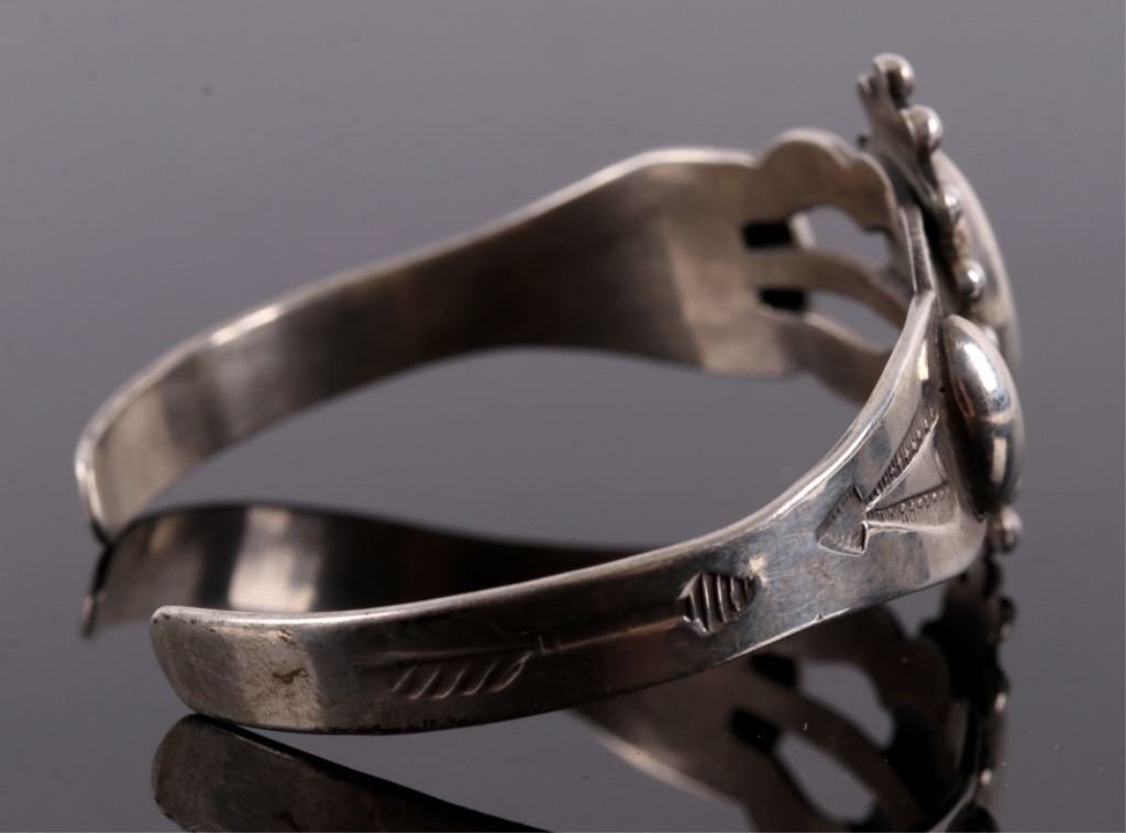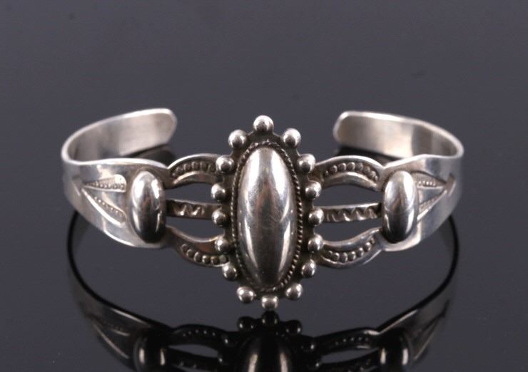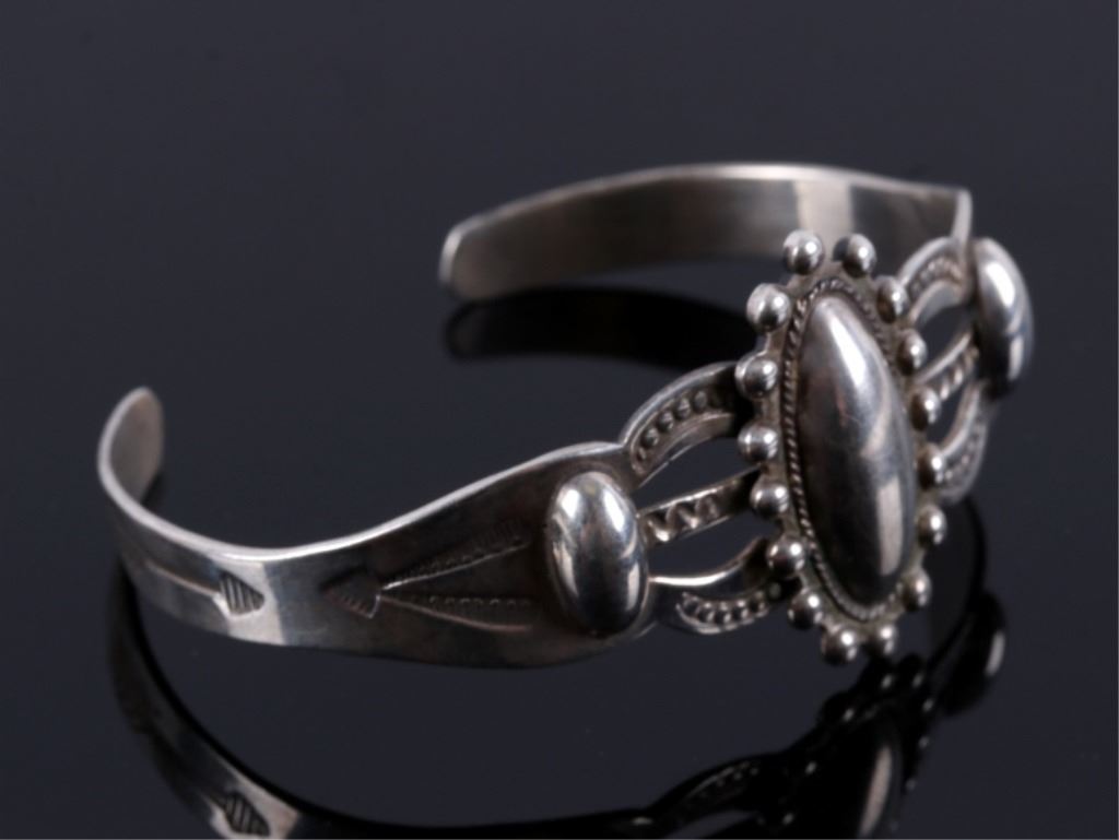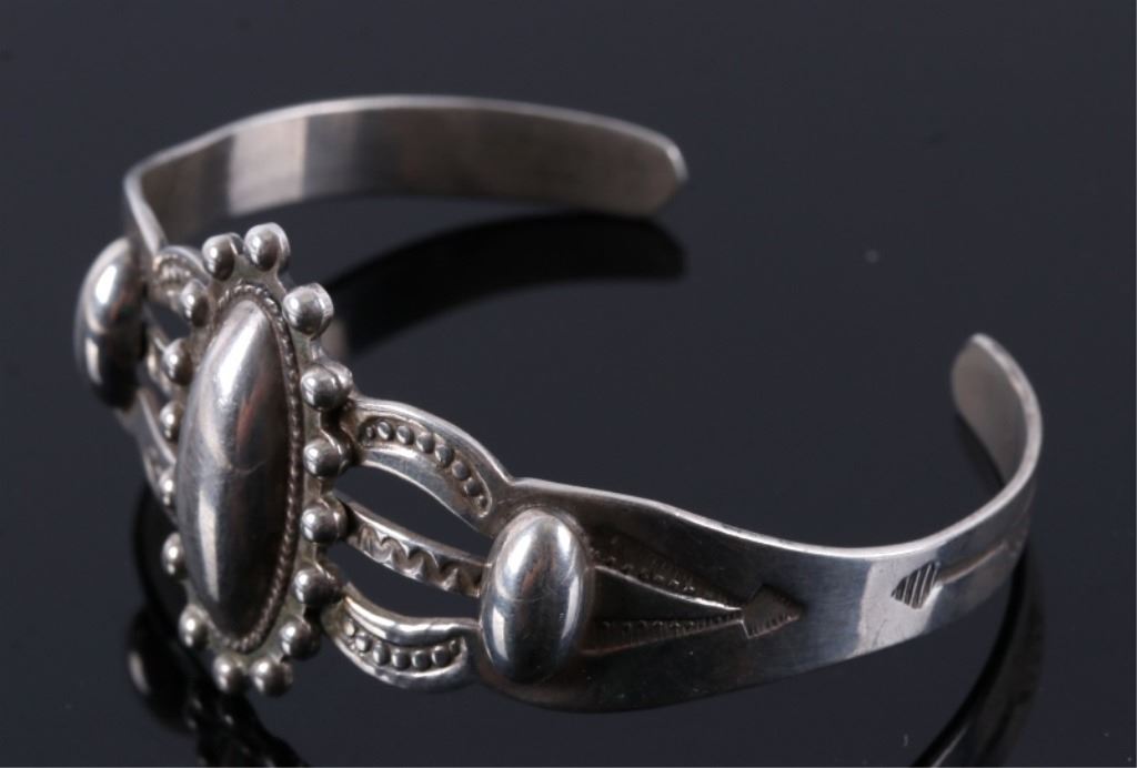 For your bidding pleasure is a Fred Harvey Navajo Native American silver bracelet from circa 1920's. Fred Harvey jewelry was made for the Anglo tourist along the Santa Fe railroad lines, in hotels and retail shops run primarily by the Fred Harvey Company. Harvey hired Navajo silversmith to create decorative symbolized jewelry for the tourist trade. Fred Harvey era jewelry is widely collected and sought after. It is easy to wear and generally features a fair amount of ornamentation and stamping. This bracelet utilizes three smaller bands to hold an applied silver stylized oval with decorative beads around the middle. The bands showcase stamped arrow designs. The circumference of the bracelet measures approximately 6".