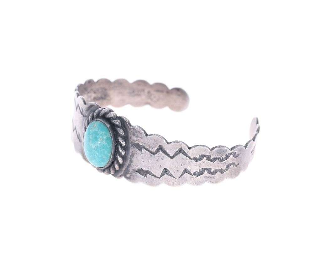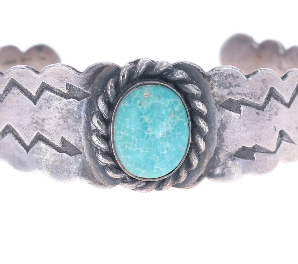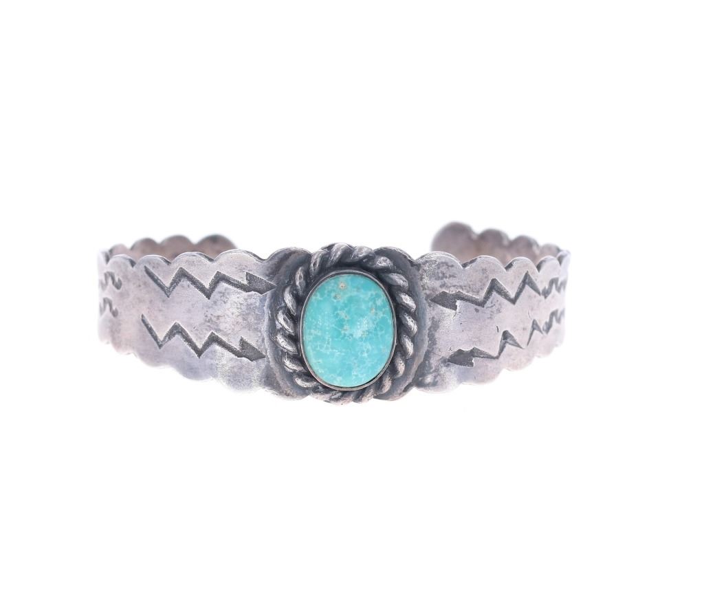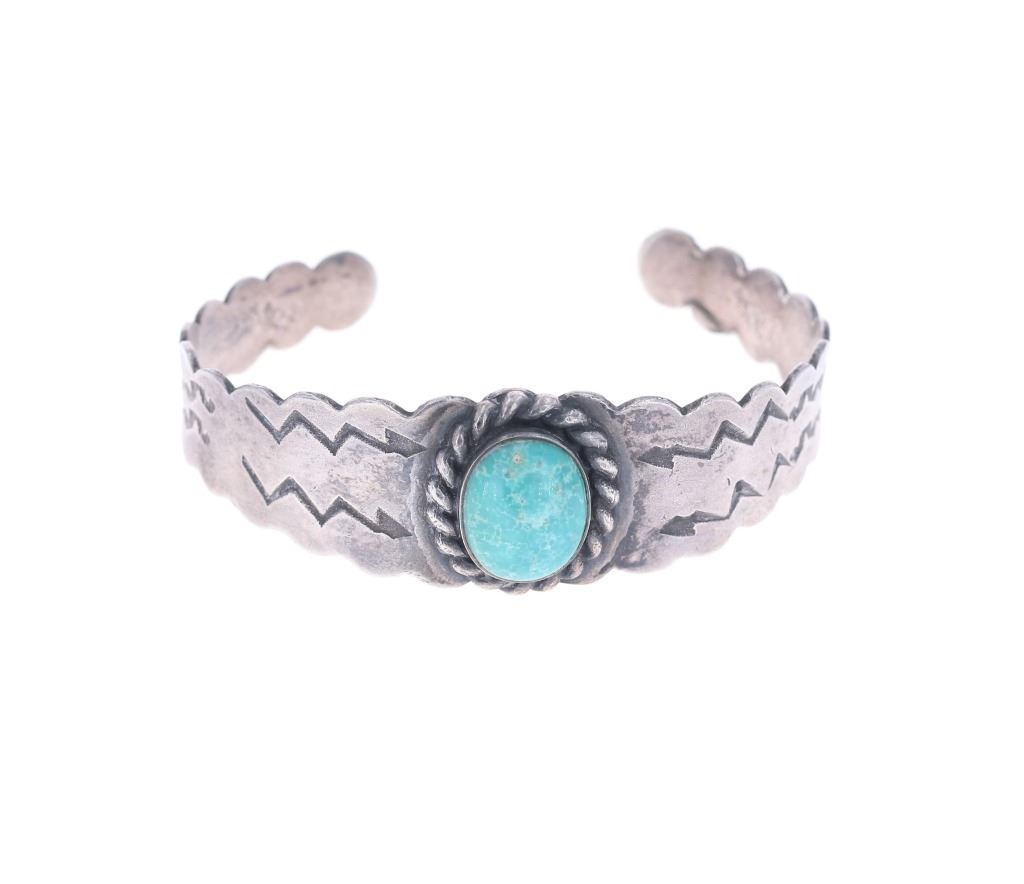 Featured in this lot is this Navajo Fred Harvey Sterling Silver and Turquoise Bracelet, circa 1940's. The bracelet features a wonderfully and professionally crafted sterling silver and turquoise construction that shows a stamped decoration that shows lightening arrows with stepped designs and scalloped edges. The center stone shows a twisted rope border around a oval around a Dry Creek turquoise cabochon set into its center. The bracelet is marked 'Sterling.' Fred Harvey era jewelry is generally a lightweight jewelry that was made for sale to the Anglo tourists along the Santa Fe railroad lines, in hotels and retail shops run primarily by the Fred Harvey Company. Fred Harvey era jewelry is widely collected and sought after as an antique jewelry genre valued for its Southwest look and historic context. It is easy to wear and generally has a fair amount of ornamentation and stamping. The condition of this Navajo Fred Harvey bracelet is good with some patina adorning the bracelet but otherwise shows good overall condition. The measurements of this bracelet is 2" x 2 1/4" x 3/4" and the circumference is 4 1/2". The collective weight of this bracelet is 18.7g.