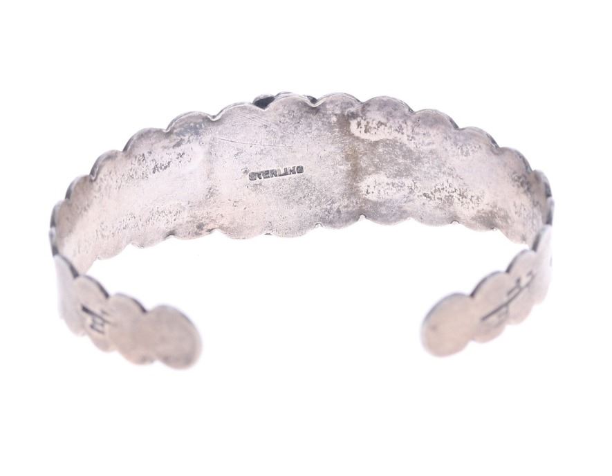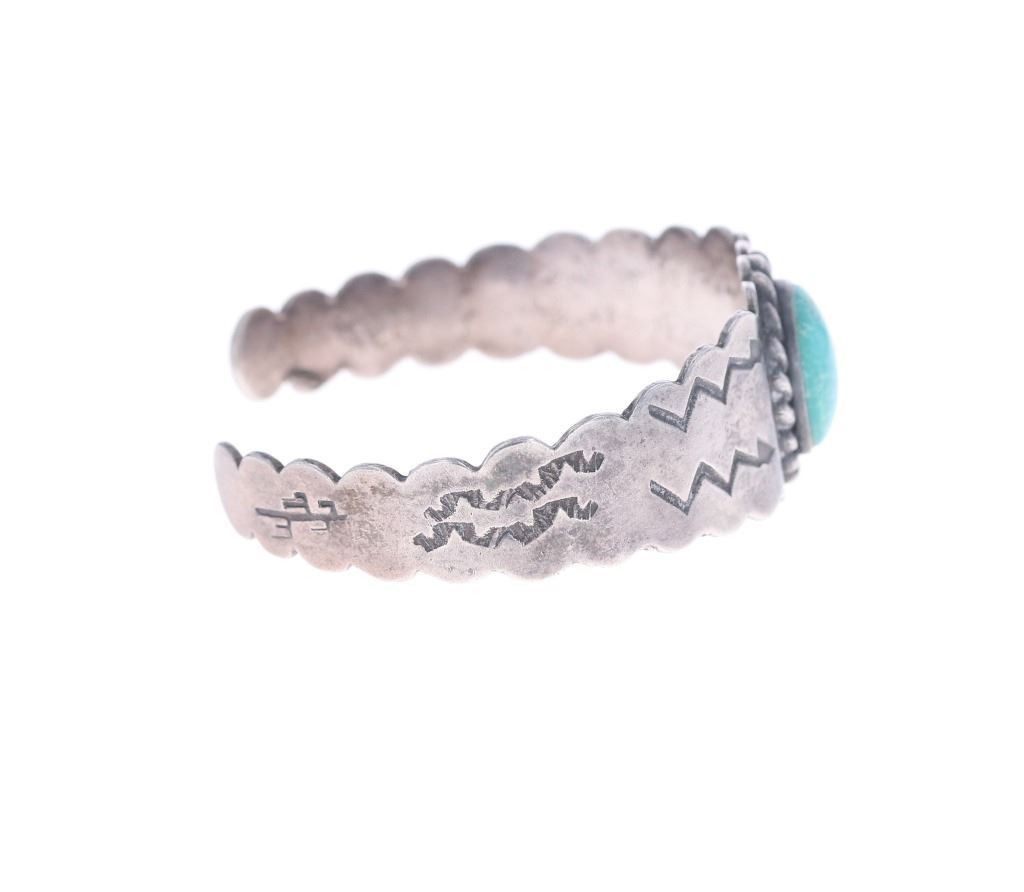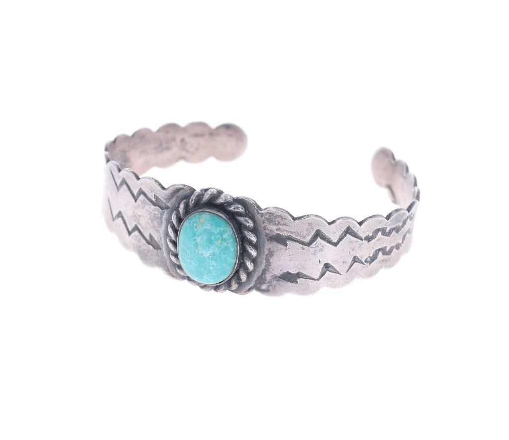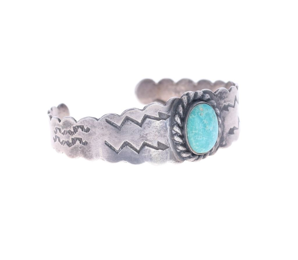 Featured in this lot is this Navajo Fred Harvey Sterling Silver and Turquoise Bracelet, circa 1940's. The bracelet features a wonderfully and professionally crafted sterling silver and turquoise construction that shows a stamped decoration that shows lightening arrows with stepped designs and scalloped edges. The center stone shows a twisted rope border around a oval around a Dry Creek turquoise cabochon set into its center. The bracelet is marked 'Sterling.' Fred Harvey era jewelry is generally a lightweight jewelry that was made for sale to the Anglo tourists along the Santa Fe railroad lines, in hotels and retail shops run primarily by the Fred Harvey Company. Fred Harvey era jewelry is widely collected and sought after as an antique jewelry genre valued for its Southwest look and historic context. It is easy to wear and generally has a fair amount of ornamentation and stamping. The condition of this Navajo Fred Harvey bracelet is good with some patina adorning the bracelet but otherwise shows good overall condition. The measurements of this bracelet is 2" x 2 1/4" x 3/4" and the circumference is 4 1/2". The collective weight of this bracelet is 18.7g.