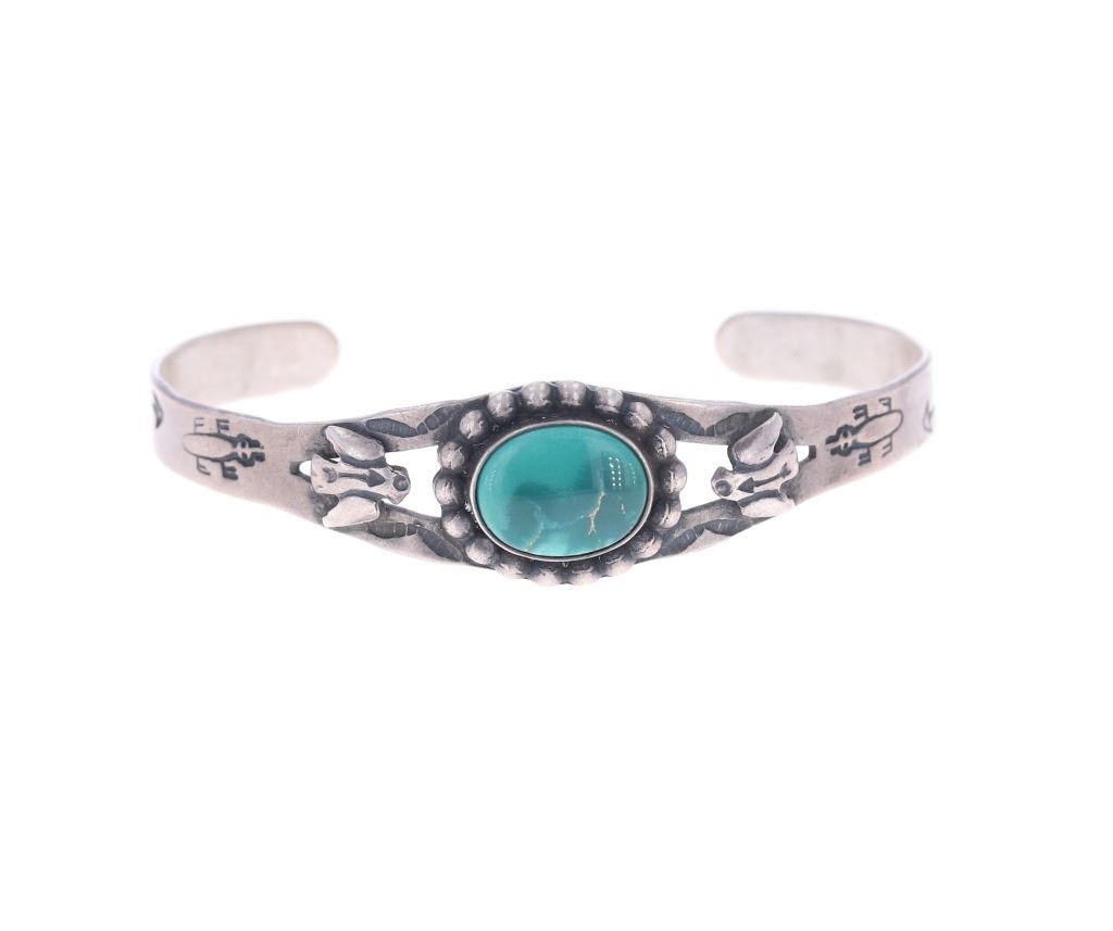 Featured in this lot is this Navajo Fred Harvey Sterling Silver and Turquoise Bracelet, circa 1940's. The bracelet features a wonderfully and professionally crafted sterling silver and turquoise construction that features some stamping and repousse decoration to the shoulders and the frame. The center stone is is an oval cut Blue Gem Turquoise with light blue and dark blue coloration. Fred Harvey era jewelry is generally a lightweight jewelry that was made for sale to the Anglo tourists along the Santa Fe railroad lines, in hotels and retail shops run primarily by the Fred Harvey Company. Fred Harvey era jewelry is widely collected and sought after as an antique jewelry genre valued for its Southwest look and historic context. It is easy to wear and generally has a fair amount of ornamentation and stamping. The condition of this Fred Harvey bracelet is good with no obvious signs of damage and shows good overall condition. The measurements of this bracelet is 2 1/8" x 2 5/8" x 5/8" and the circumference is 5". The collective weight of this bracelet is 14.1g.