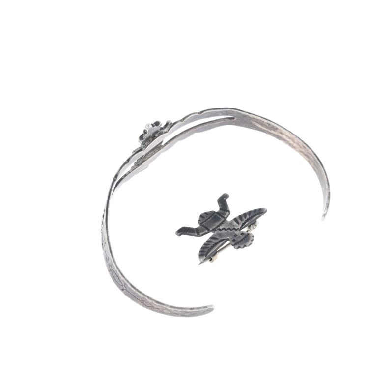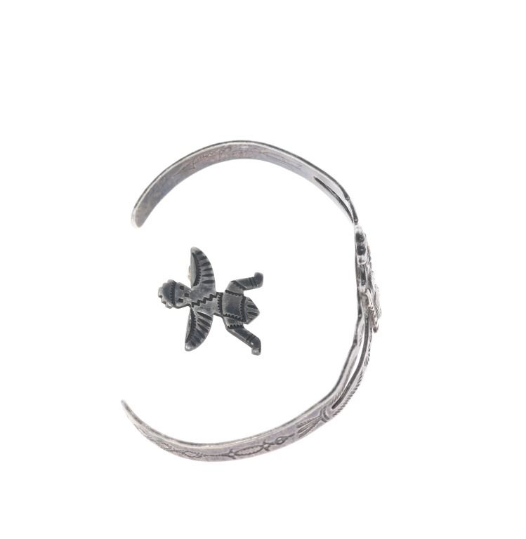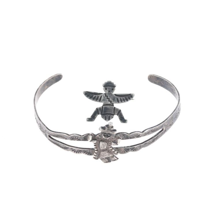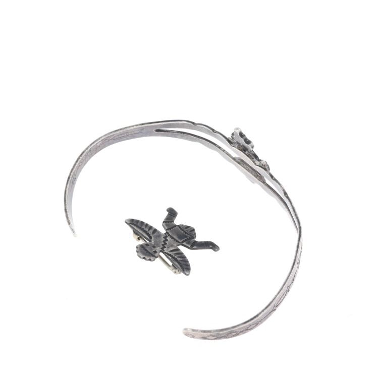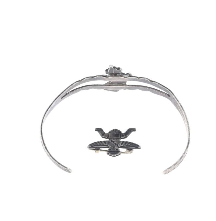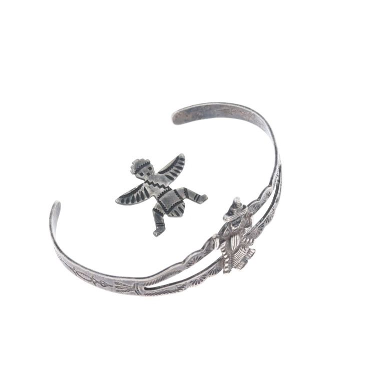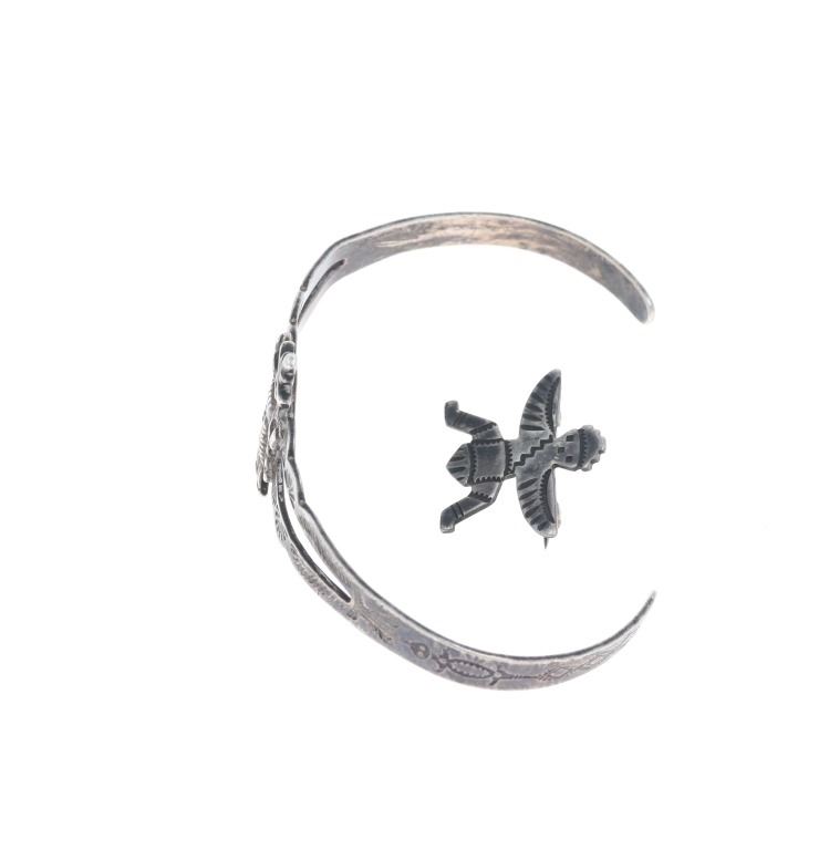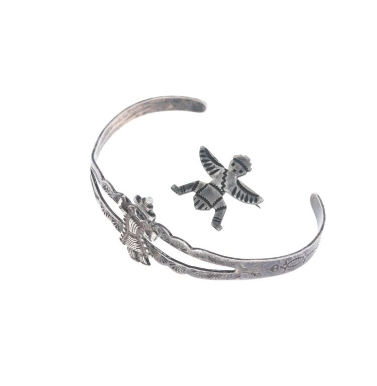 Featured in this lot is this Navajo Fred Harvey Pawn Style Silver Arrow sterling silver Kachina Jewelry. There is a bracelet and a pin in this collection. The bracelet features a wonderfully and professionally crafted sterling silver construction that features a stamped and tooled design of a Kachina man with a split shoulder, and is marked on the underside of the bracelet "Silver Arrow" and shows a "Sterling' stamp next to the hallmark. The pin features a wonderfully and professionally crafted sterling silver construction that features a spread eagle Kachina design that shows a stamped and tooled pin face. The condition of this group of jewelry is good with no obvious signs of damage and shows good overall condition. The measurements of this bracelet is 1 5/8" x 2 3/8" x 7/8" and the pin measures 1/2" x 7/8" x1/8". The collective weight of this bracelet and pin is 10.4g. Provenance: From the renowned Sundog Fine Art Bozeman, Montana collection and acquired by Bruce VanLandingham. Bruce VanLandingham was a pillar in the American Indian collecting community and a respected expert. Along with being an avid collector, Bruce also was the sole owner of Sundog Fine Art Gallery in Bozeman, which was both part museum and gallery.
