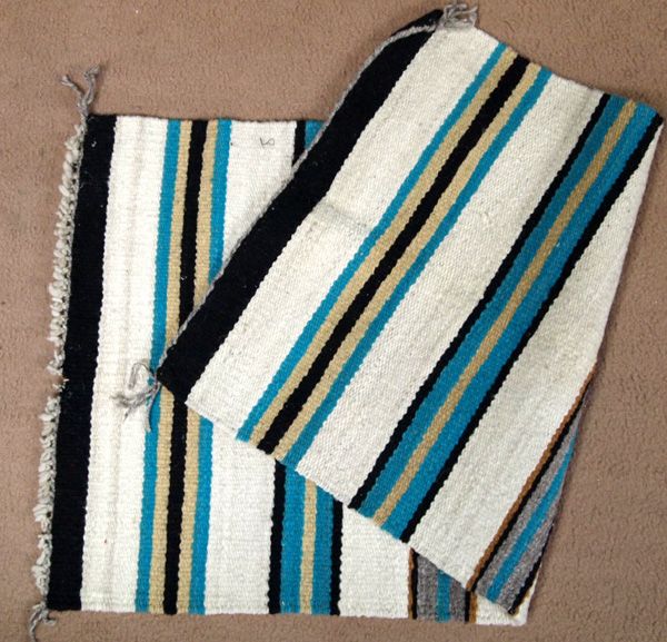 Navajo Gallup New Mexico Textile. 35.5''L x 19.5''W. Turquoise, black, white and brown striped. Really nice for display. Navajo rugs and blankets are prized by collectors all over the world for their beauty and durability. They are truly among the great icons of Southwest Native Arts. For many Navajo women, weaving is not only a source of livelihood, it is a way to participate in traditional Navajo culture and community. expressing beauty, harmony, and balance
