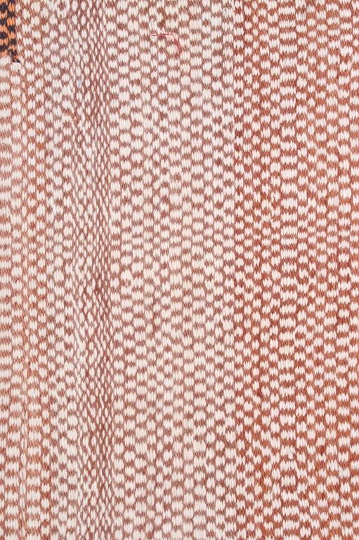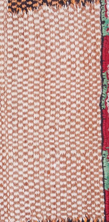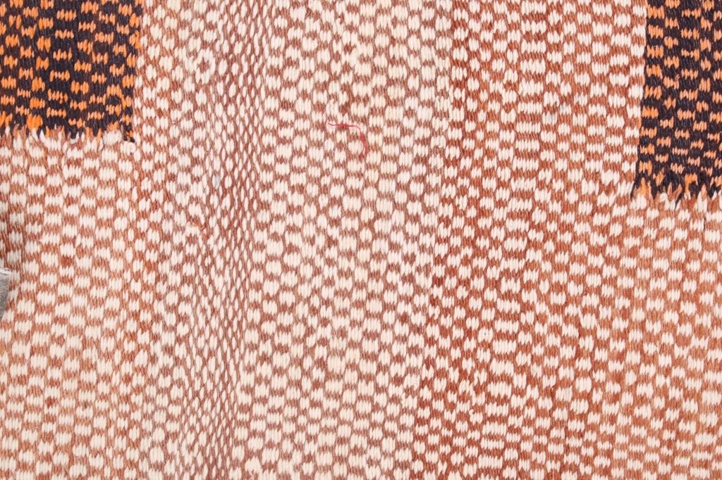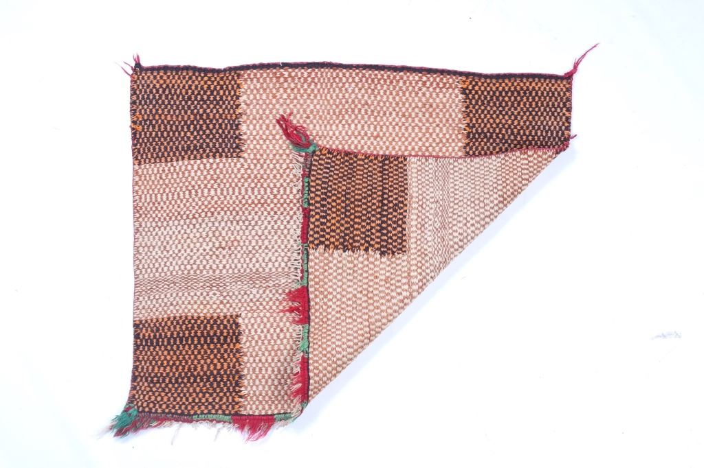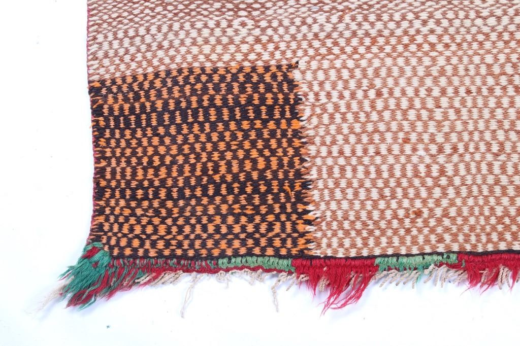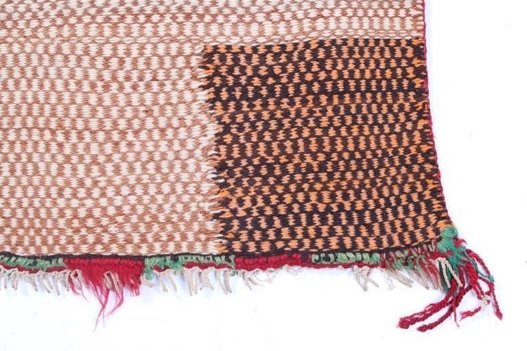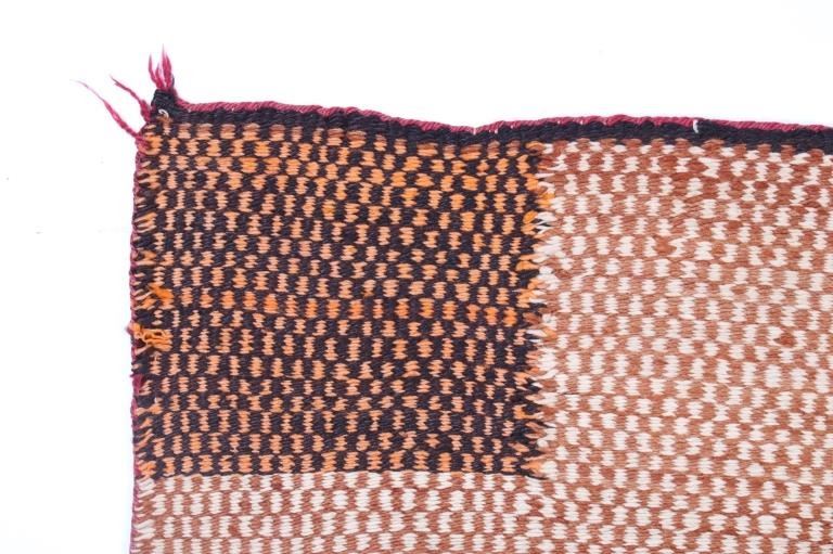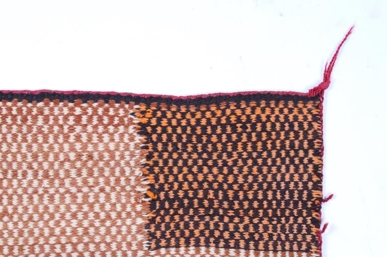 Featured in this lot is this Navajo Gallup throw Trading Post wool rug, circa 1930's. On one end of the rug shows the typical two end fringe with no center fringe, shown only on authentic Navajo rugs. On the other side is the added cotton warp fringe, only found on Gallup, New Mexico Navajo throw examples. The rug shows a yellow and light brown checkered design, which is extremely rare to Navajo rugs; it also shows an added and sewn in fringe on one side of the rug. The condition of this Trading Post wool rug is good for its age, with wear to the corners and slight wear to the side edges of the rug. The measurements of this Gallup Trading Post rug are 29" x 34".