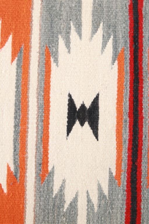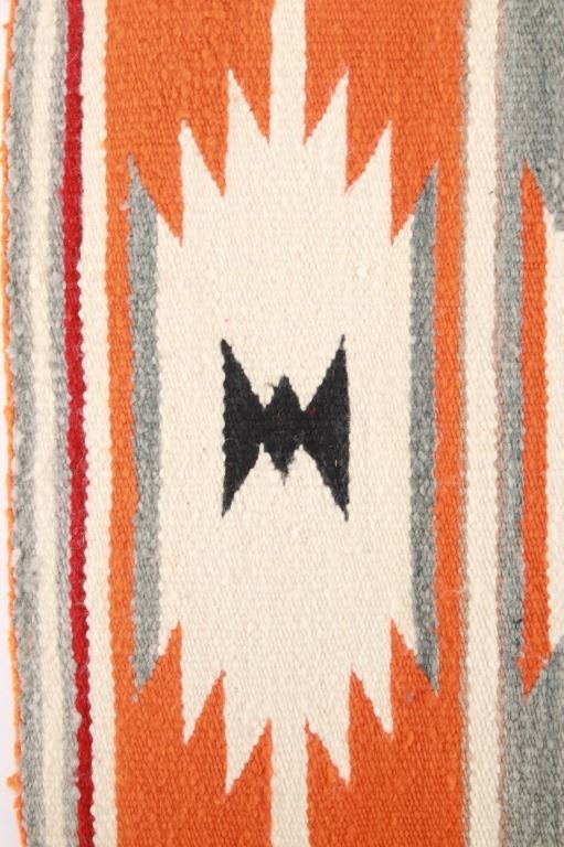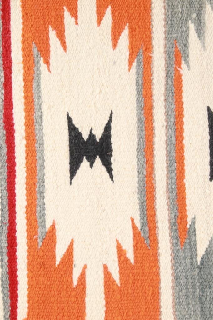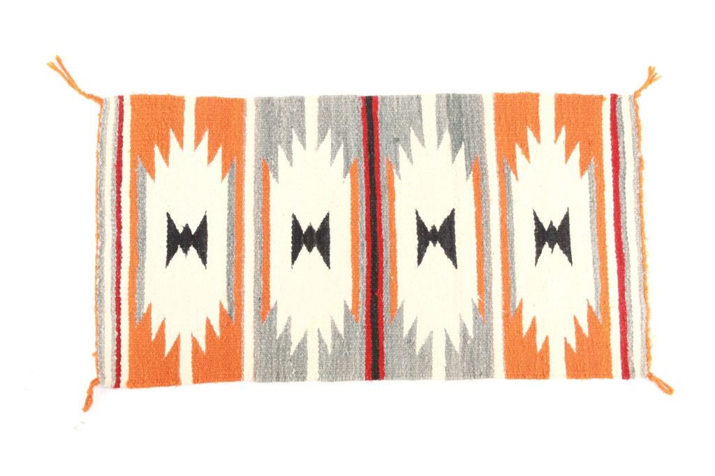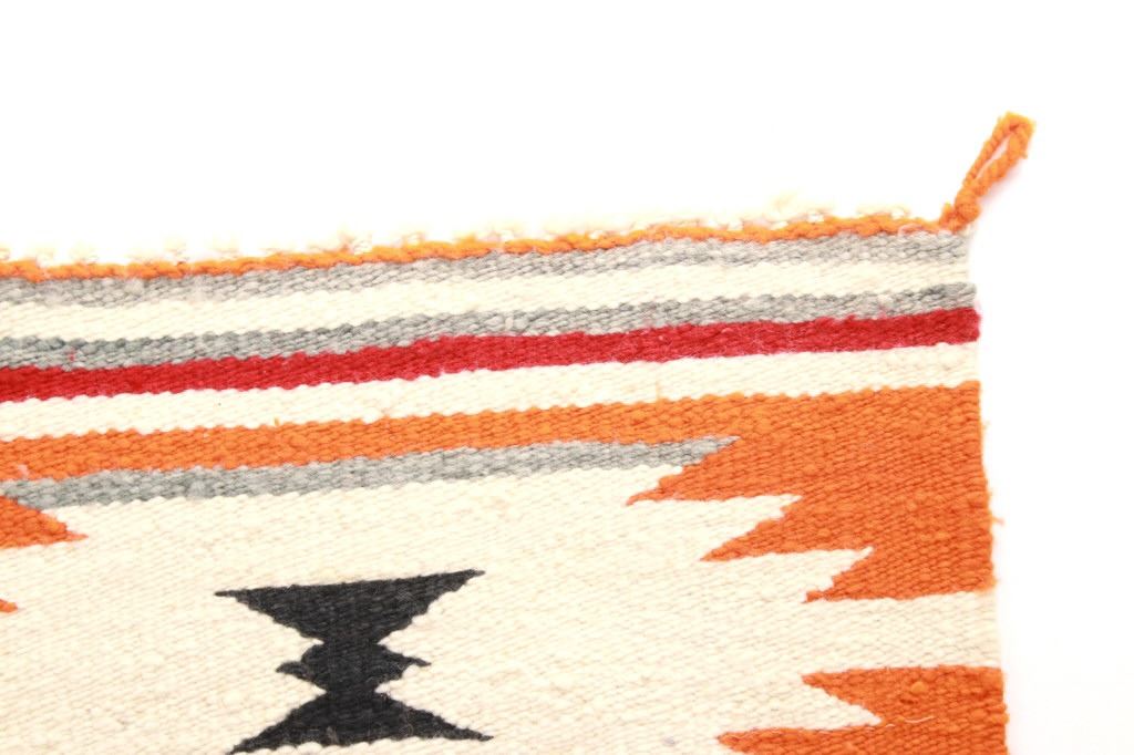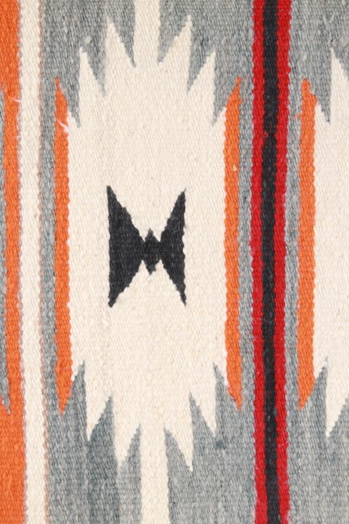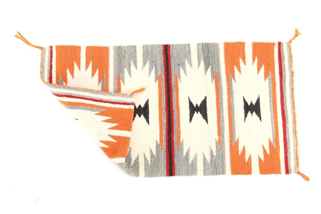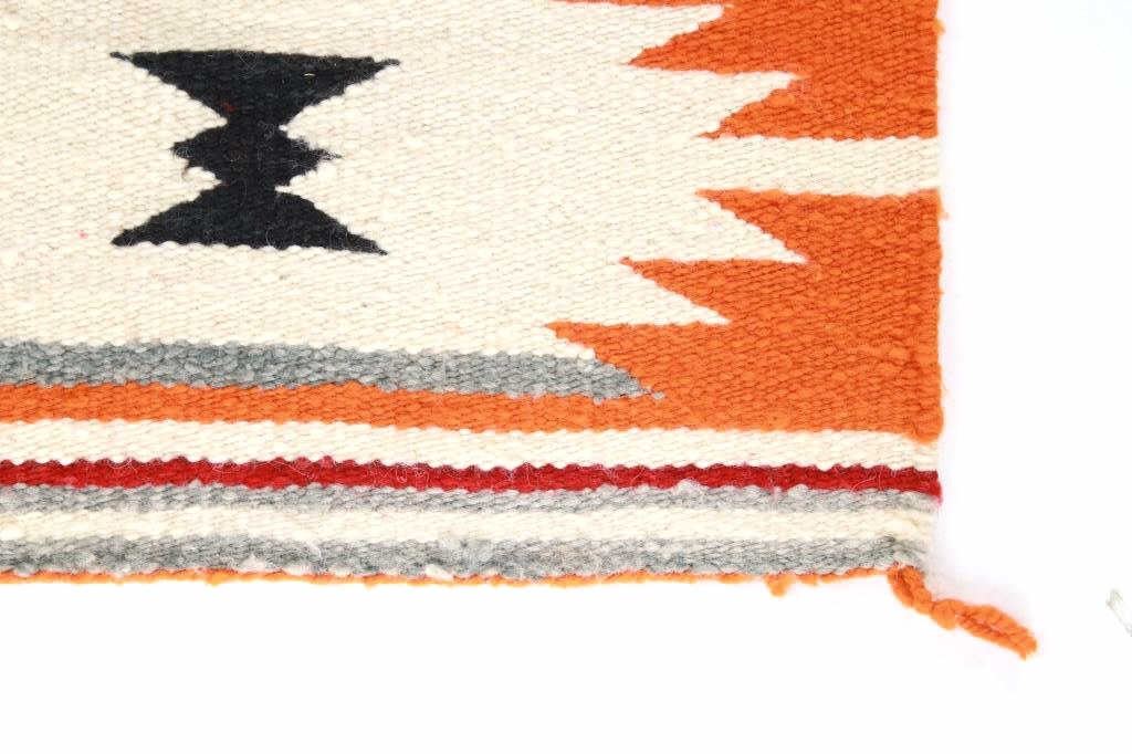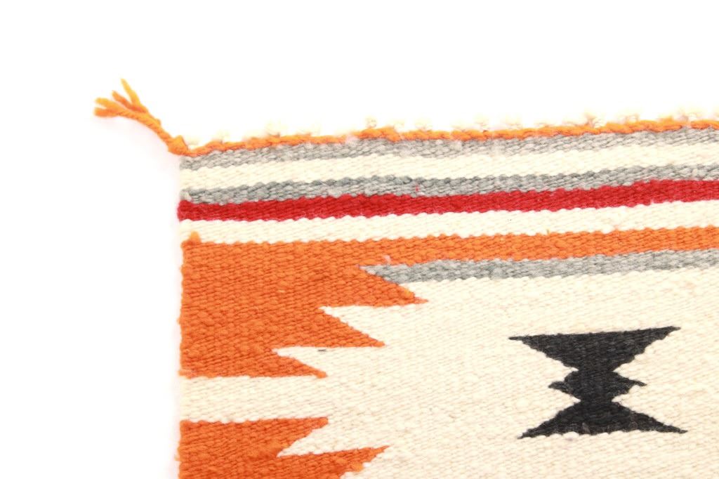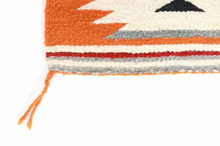 Featured in this lot is this Navajo Gallup Trading Post Crystal rug circa 1960's. The rug features a wonderfully and professionally wonderfully and professionally crafted wool construction. The rug features a banded design with heathered grey field and shows medallions of off white, orange and black accents in its center with small bands of red and black coloration with a traditional Gallup fringe on one end and four orange tassels on the corners. The condition of this hand woven rug is good with no obvious signs of damage and shows good overall condition. The measurements of this rug are 35" x 18 1/2". The thread count is 96 threads per square inch.