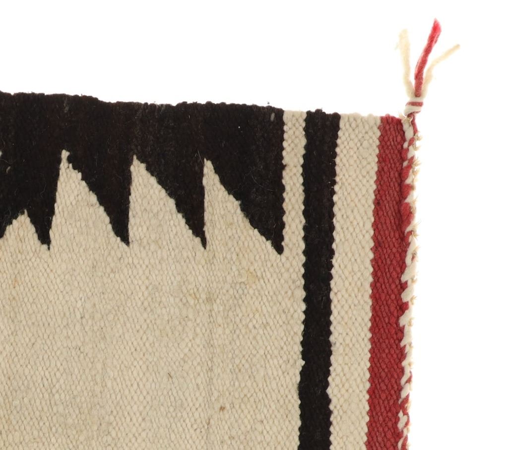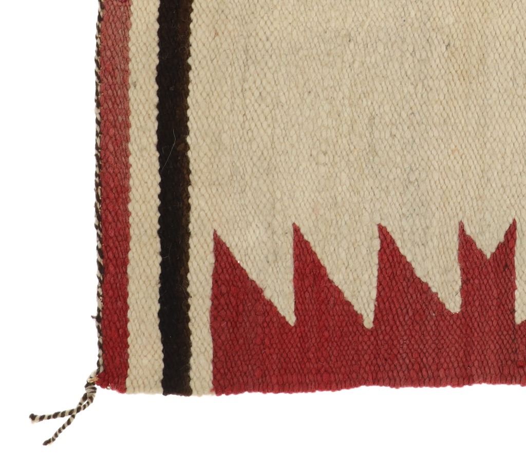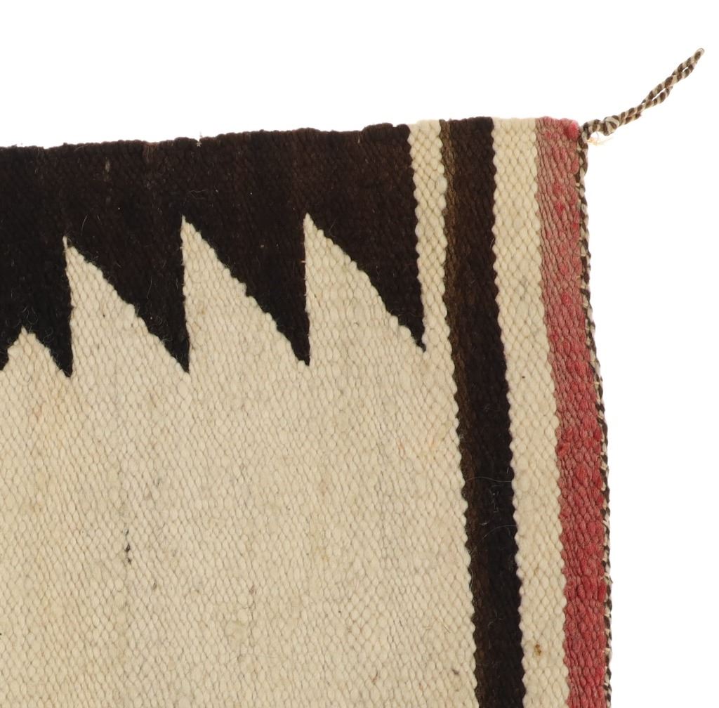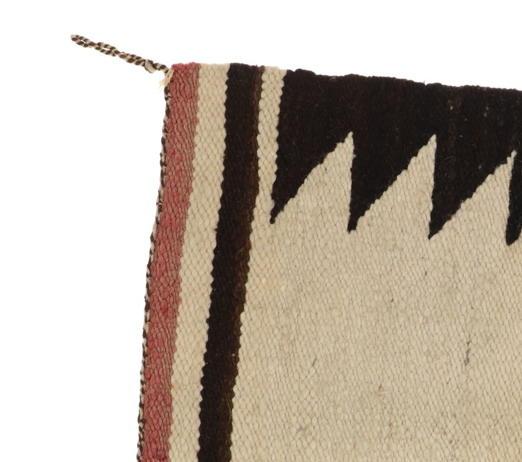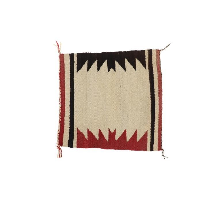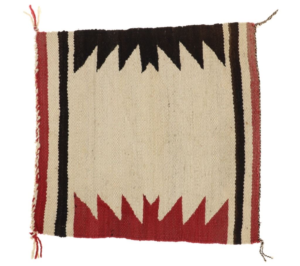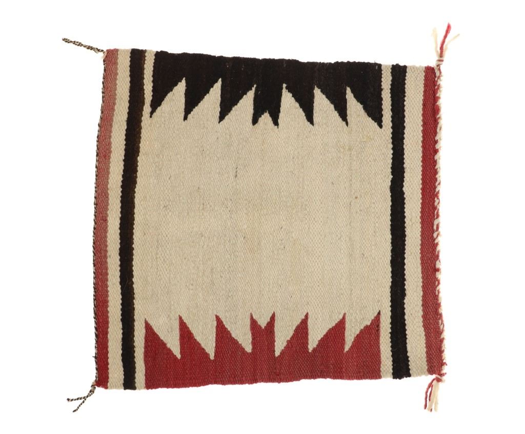 Featured in this lot is this Navajo Gallup Trading Post rug circa 1940's. The rug features a wonderfully and professionally crafted wool construction that shows a off white field with a slight stepped design to the sides of the rug in red with bands of heathered brown to black and red towards the ends of the rug. The condition of this Navajo rug is well preserved with some fading to the red bands at the ends and but otherwise shows well preserved condition. The measurements of this rug is 18 1/4" x 17 1/4". The thread count is 63 threads per square inch.