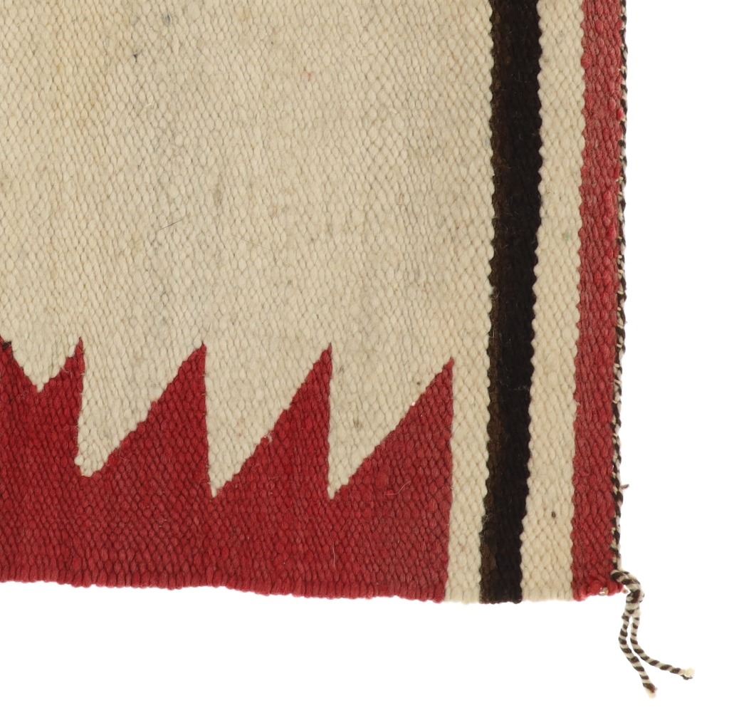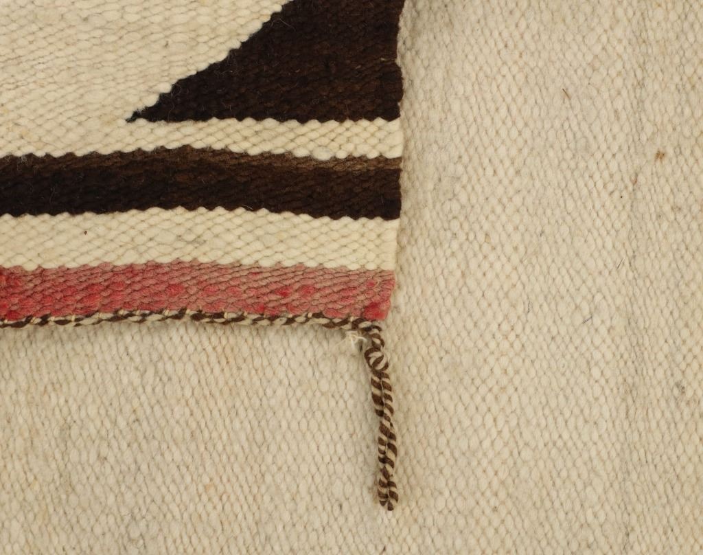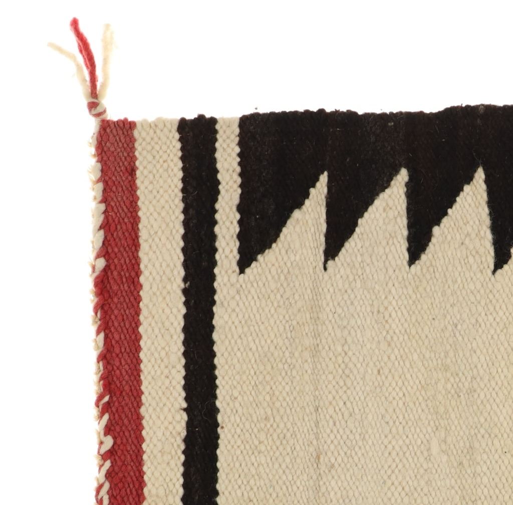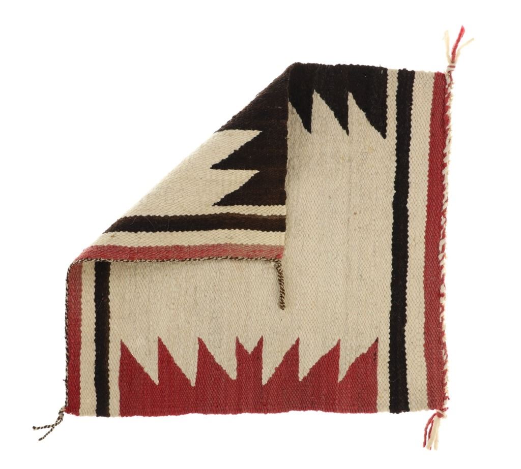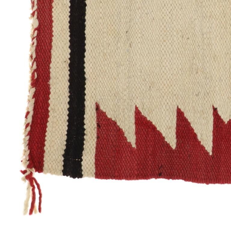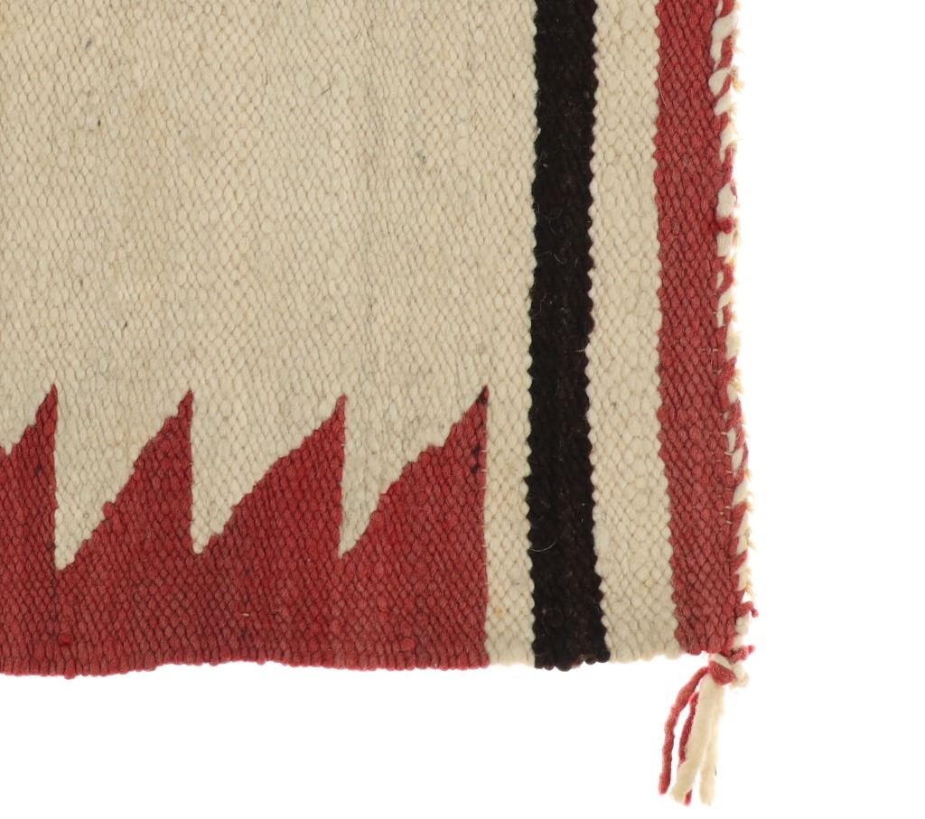 Featured in this lot is this Navajo Gallup Trading Post rug circa 1940's. The rug features a wonderfully and professionally crafted wool construction that shows a off white field with a slight stepped design to the sides of the rug in red with bands of heathered brown to black and red towards the ends of the rug. The condition of this Navajo rug is well preserved with some fading to the red bands at the ends and but otherwise shows well preserved condition. The measurements of this rug is 18 1/4" x 17 1/4". The thread count is 63 threads per square inch.