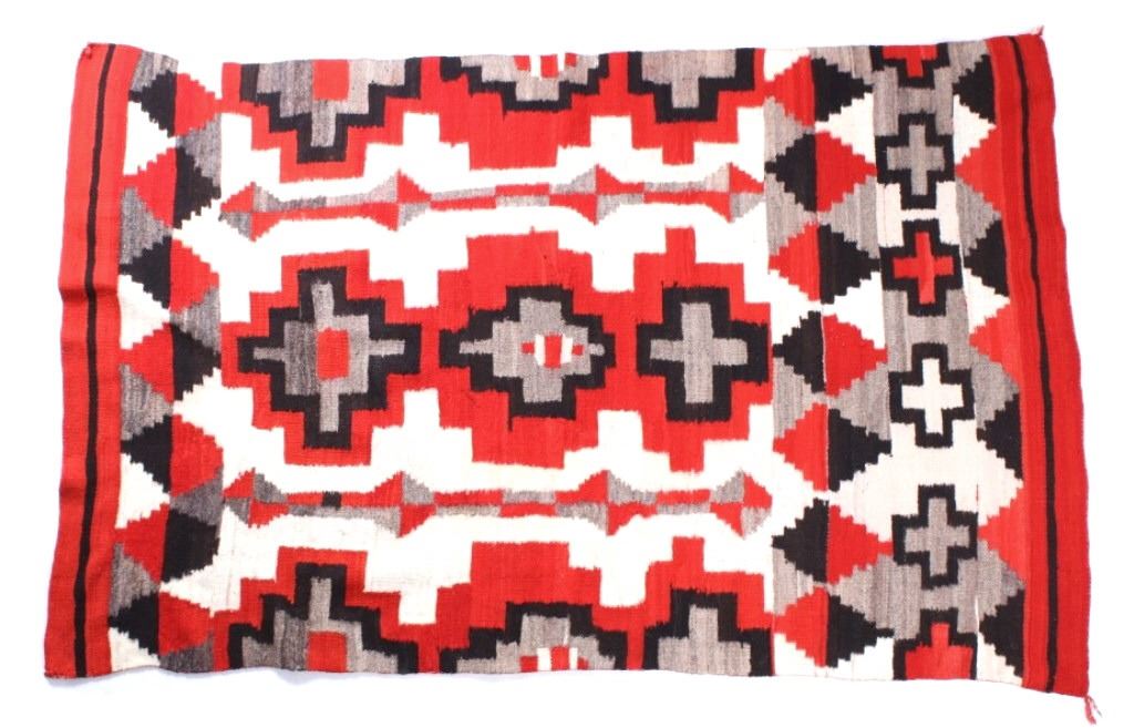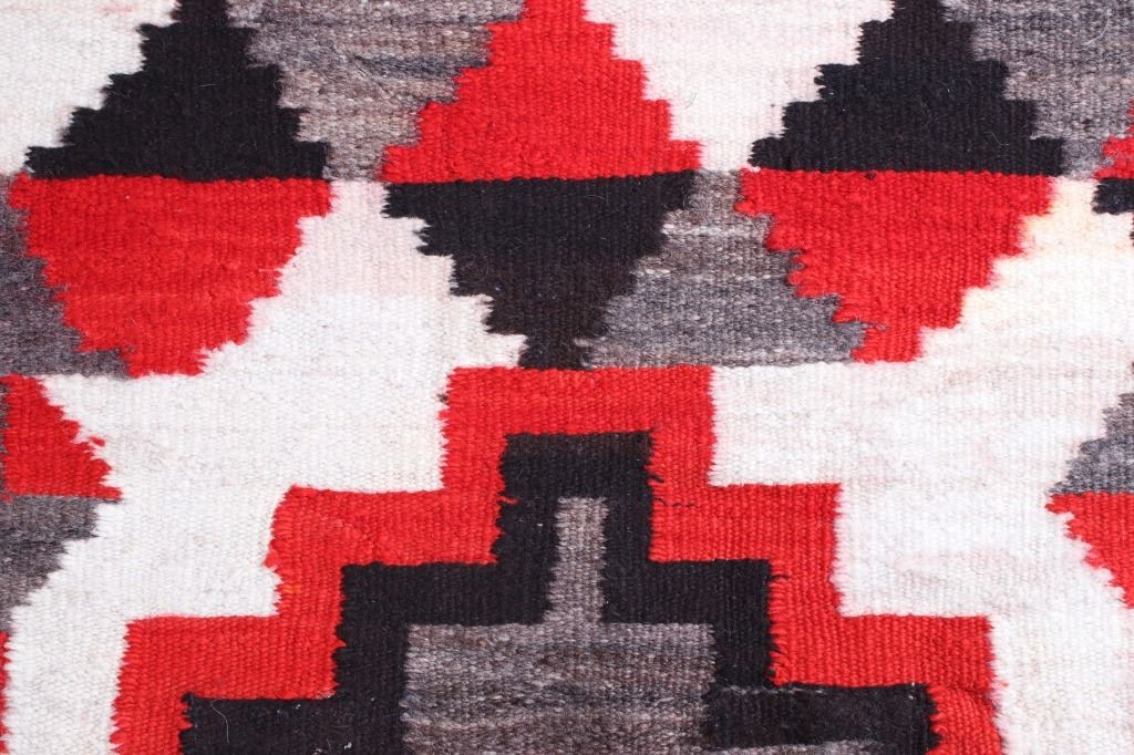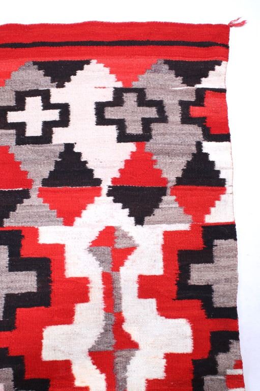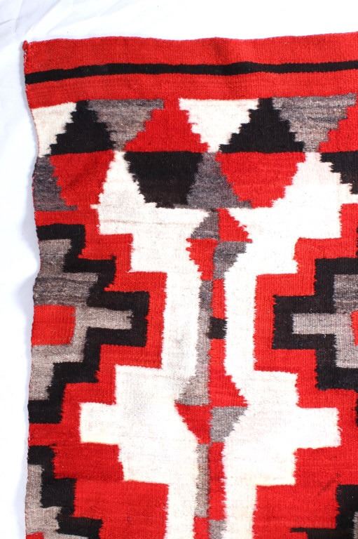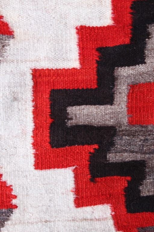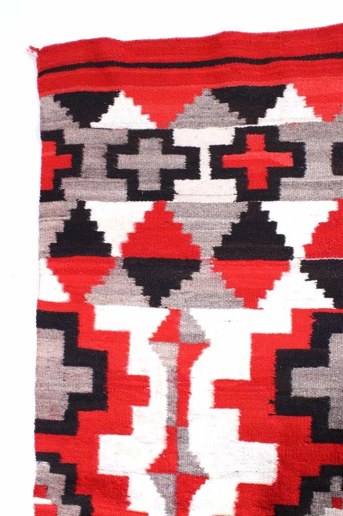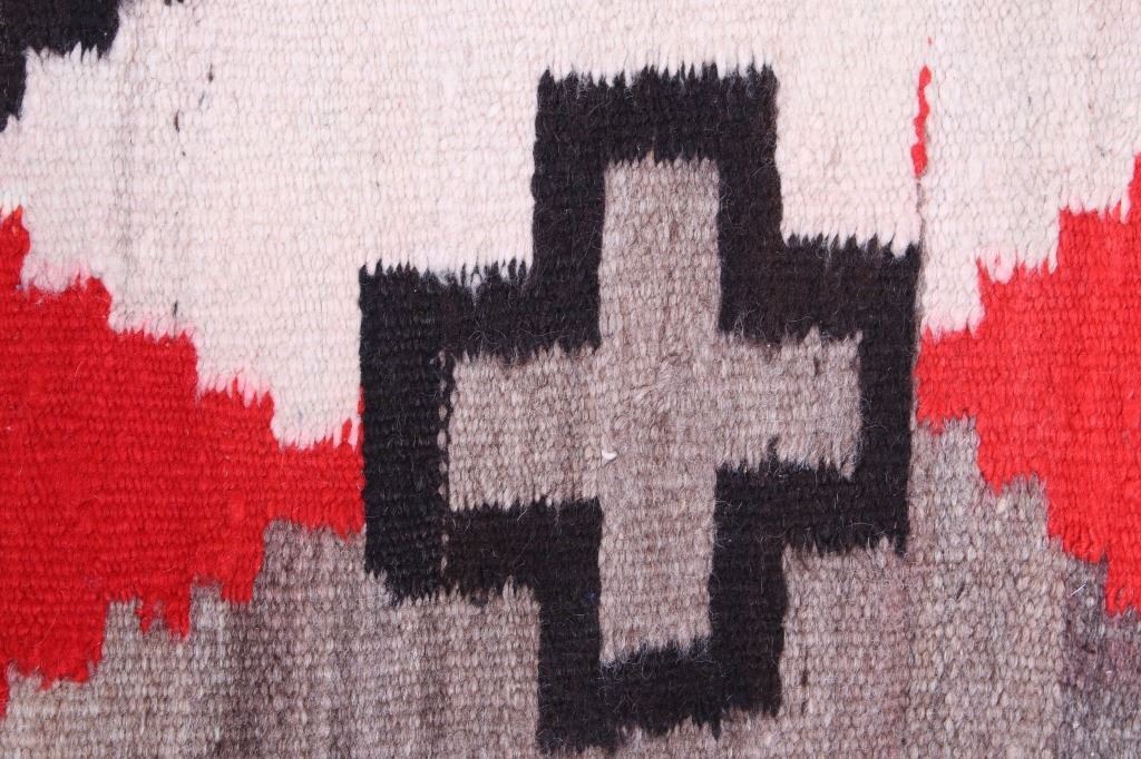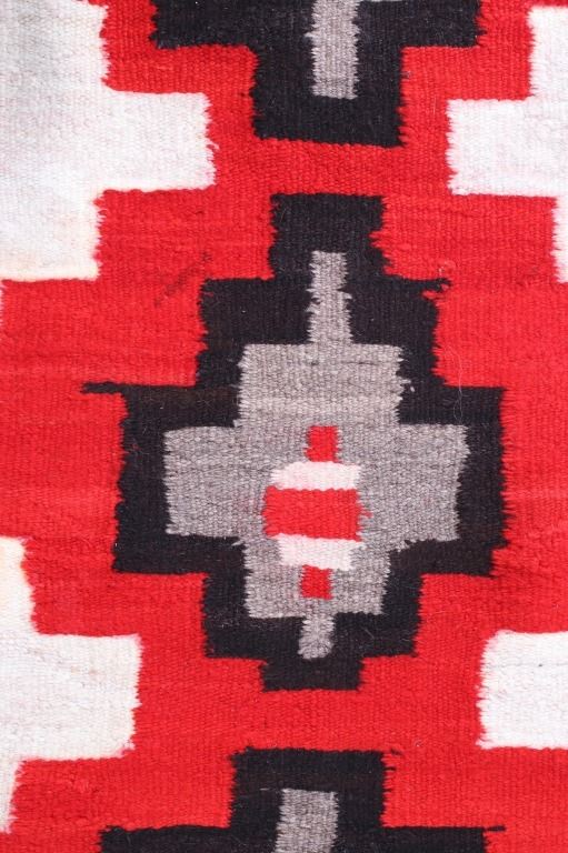 For your consideration is this very rare original circa early 1900's Navajo Native American Ganado Rug. Located in the southwest of Crystal in the geographical center of the Navajo Reservation the Ganado pattern of weaving was established by Lorenzo Hubbell in late 1800. The motif generally consists of one or more stepped diamonds or stepped and embellished triangles. The colors are usually dominated by a red background with gray, ivory, black and red designs surrounded by geometric border. This rug shows pristine craftsmanship made from 100% soft high-quality wool and shows the red background with many good examples of the stepped diamonds, and multiple colors of crosses. The coloration is done in natural pigmented red, gray, black, and ivory. The rug is believed to be early 1900's work and is in very good condition. The measurements of the rug are 84" x 52".