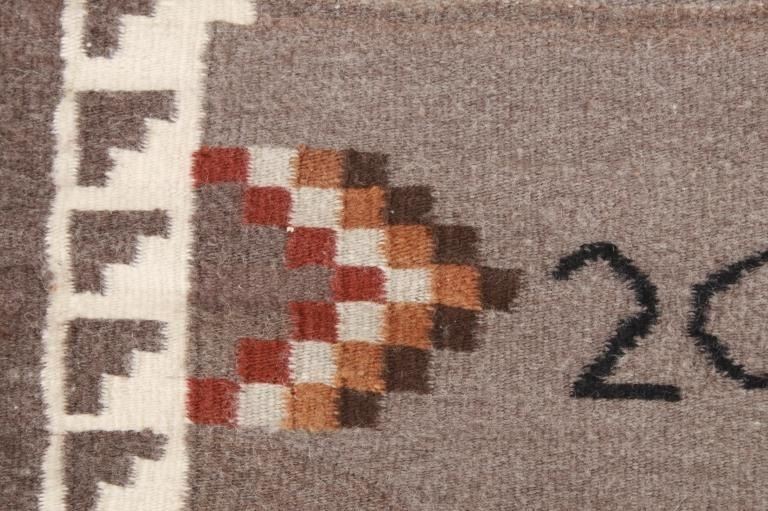 Featured in this lot is this Navajo Ganado Trading Post hand woven rug circa 2005. This hand woven rug is wonderfully and professionally crafted wool construction that features a stepped square decoration to both sides of the rug with coloration of white, brown, red, grey, and light brown with a grey and heathered brown field and shows a black border to the top and bottom of the rug. The rug features all four tassels and has ' 2005' woven into the center of the rug. The condition of this rug is good with no obvious signs of damage and shows good overall condition. The measurements of this rug are 25 1/4" x 28 1/2". The thread count is 190 threads per square inch.