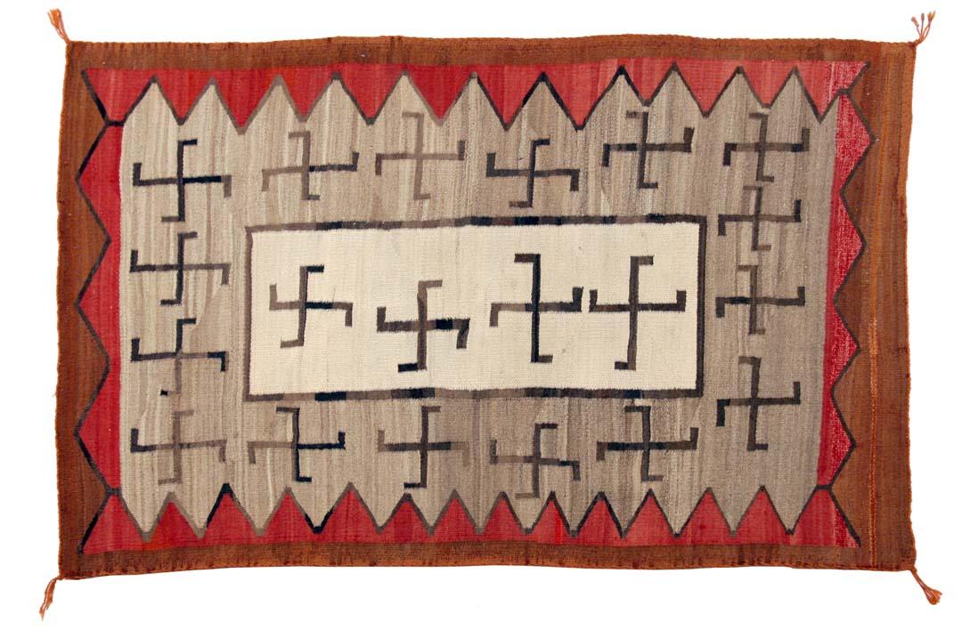 Navajo Weaving. 65" x 40" . Ganado area. Fancy design with 20 whirling logs. Circa 1900-1915. (est $1,000-1,500). For condition reports please visit: www.auctioninsantafe.com/cr2011.pdf