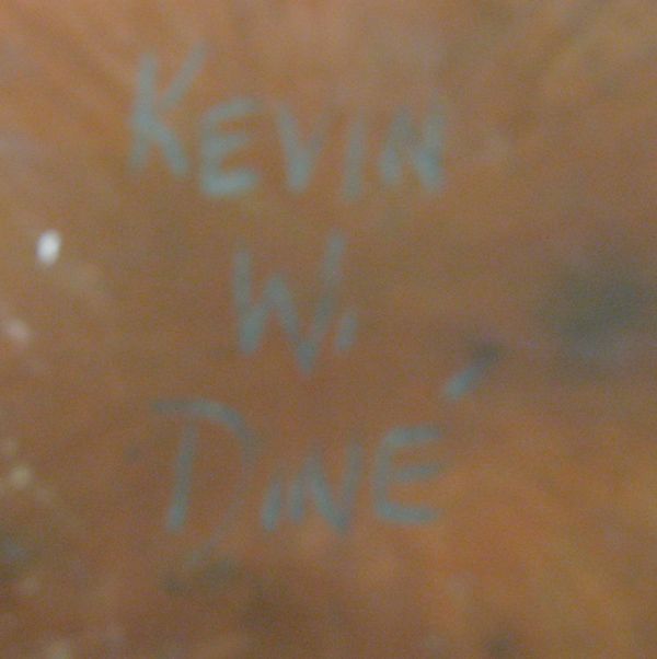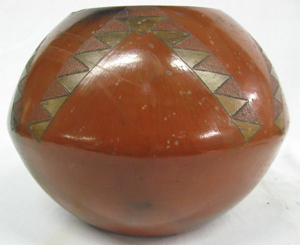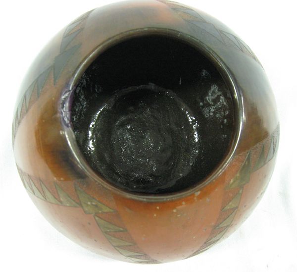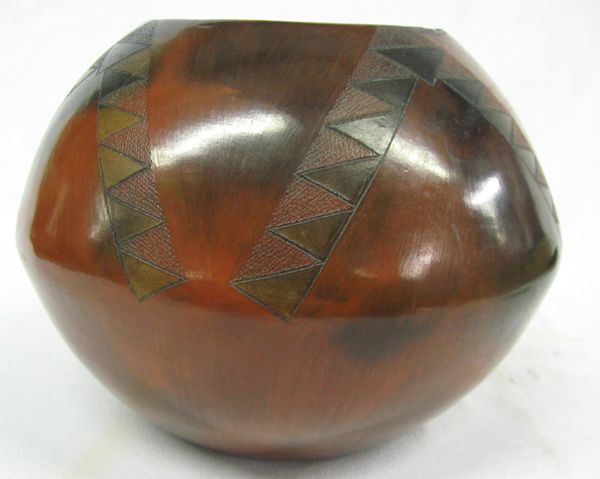Navajo Geometric Jar by Dine' Kevin Williams. Kevin is the grandson of noted potter Rose Williams. This large jar was created in the traditional coil and pinch manner, coated with hot pinion pitch to seal the pottery which gives the piece the distinctive red-brown color found in Navajo pottery. The black smoke clouds are known as ''fire clouds'' and considered blessings from the creator and especially prized. The jar is hand-etched in traditional patterns. Signed ''Kevin W. Dine''', measuring 6 1/2'' high by 8 1/2'' wide. There is a repair on the edge.