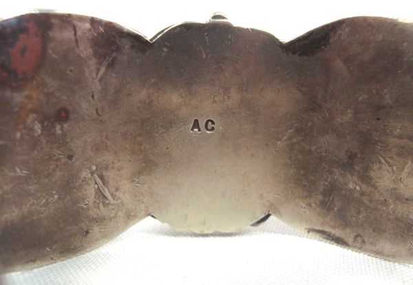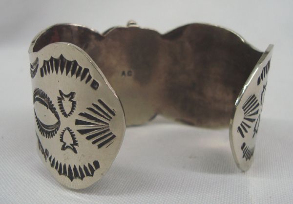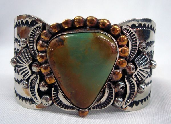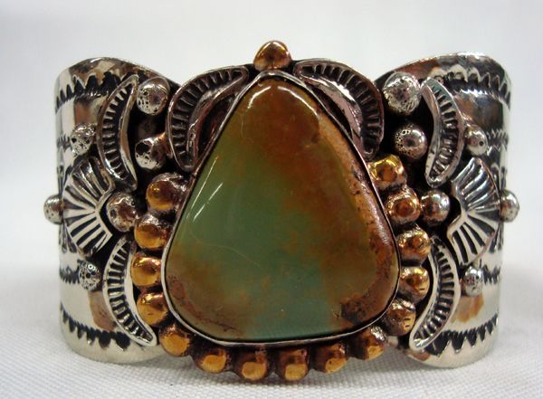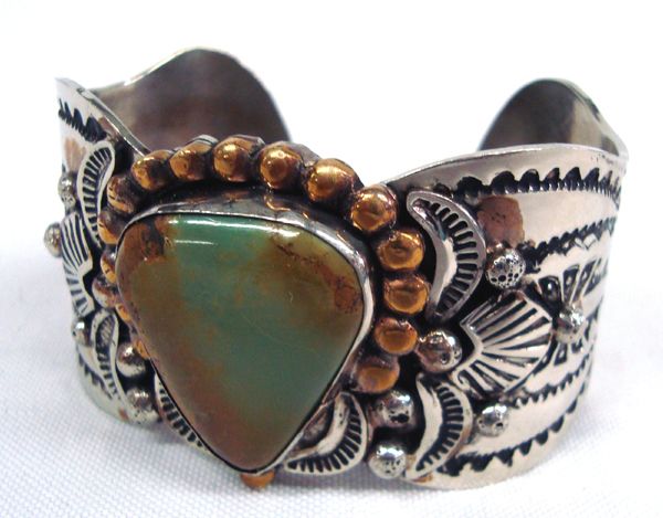 Navajo German Silver Bracelet - Albert Cleveland. Brilliant German Silver cuff style bracelet with stamped designs and gold overlay. There is a large teardrop green turquoise cabochon that has gold matrix in the setting. Stamped ''AC'' on the back for the artist, Albert Cleveland. Measures 6-7/8'' inside  including opening and 1.5''W.