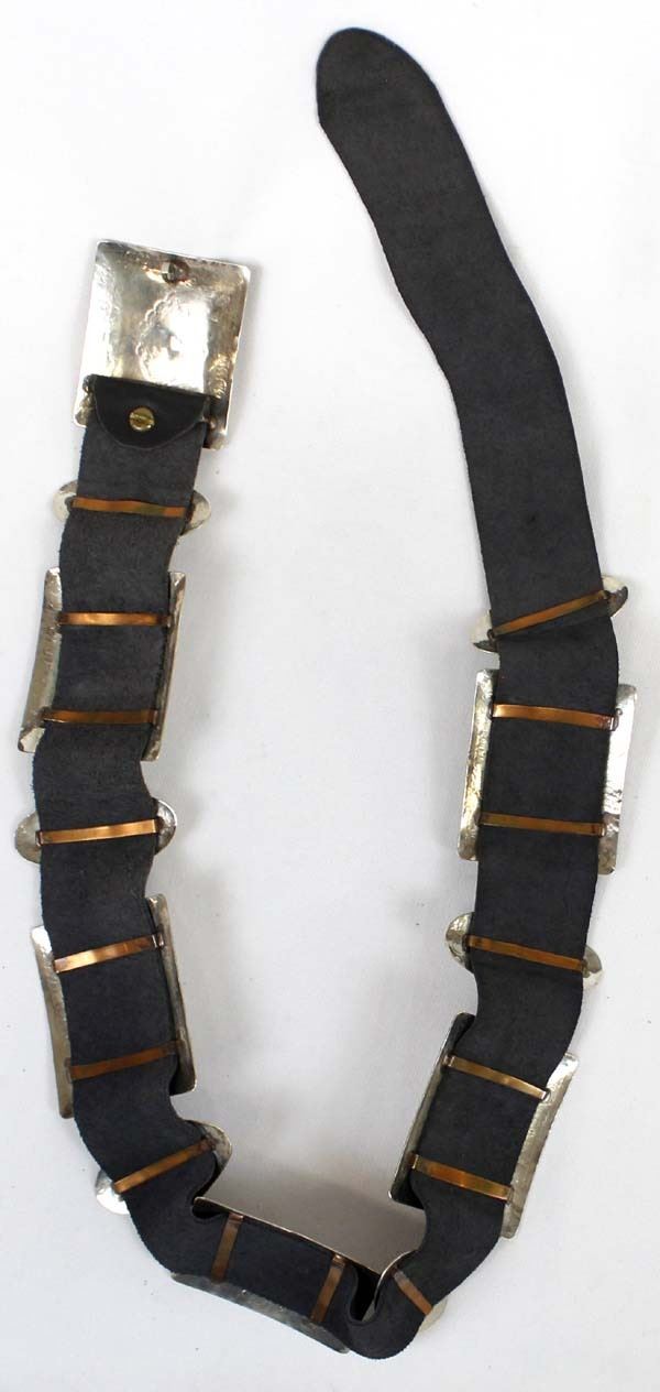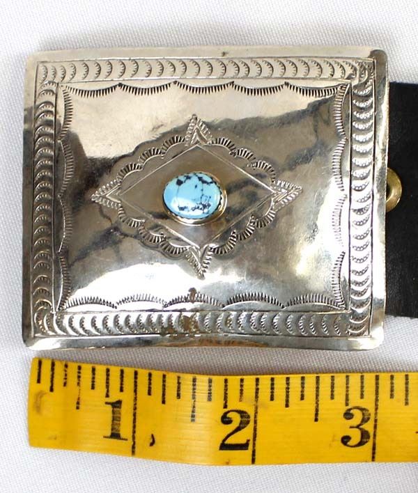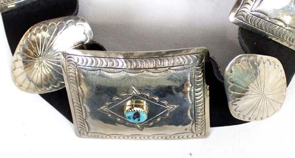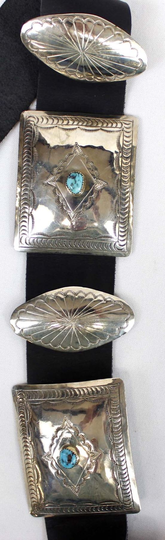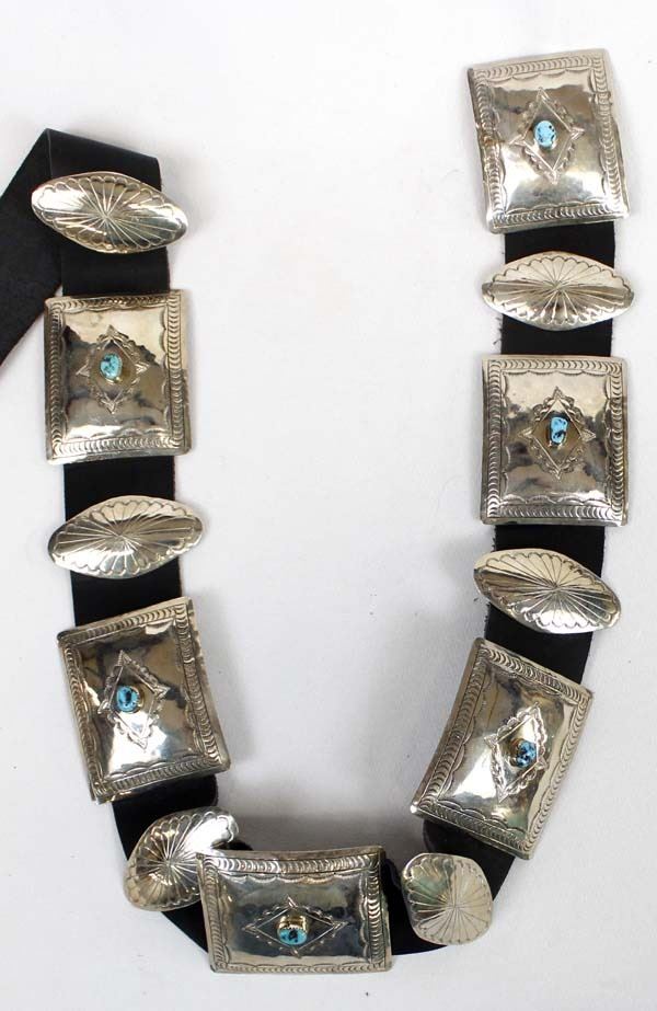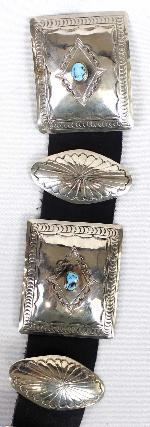Gorgeous Navajo German Silver Rectangular Concho on Leather Belt. Rectangular conchos have turquoise cabochons. Measures 42'' end to end and a 2'' leather width. Rectangle Concho measures 3 1/4'' x 2 1/2''.