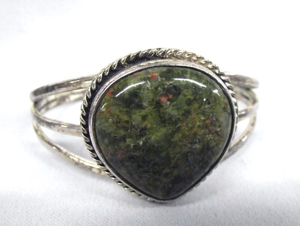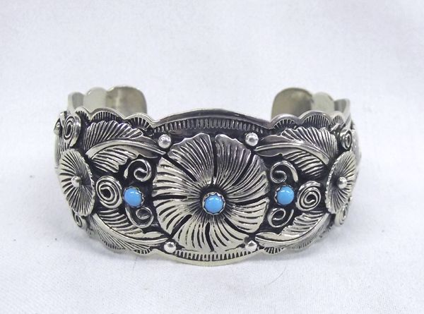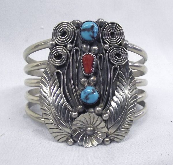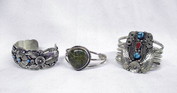 Navajo German Silver & Turquoise Bracelets, they each feature traditional style Navajo Settings. Largest bracelet measures 7.25'', including opening x 2'' wide with turquoise and coral, 5 banded, large green jasper cabochon set on a 3 band sterling silver bracelet, cuff style bracelet with small turquoise flower accents, signed ''RS'' for Roger Skeet. Beautiful collection, each with a specific style!