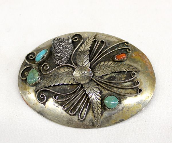 Navajo German Silver Turquoise Coral Buffalo Head Belt Buckle, hallmarked JR, traditional Navajo style setting of leaves, scrollwork, and flower, 3 turquoise cabochons .25in x .5in and 1 coral cabochon .25in x one eighth, measures 3in H x 4in W