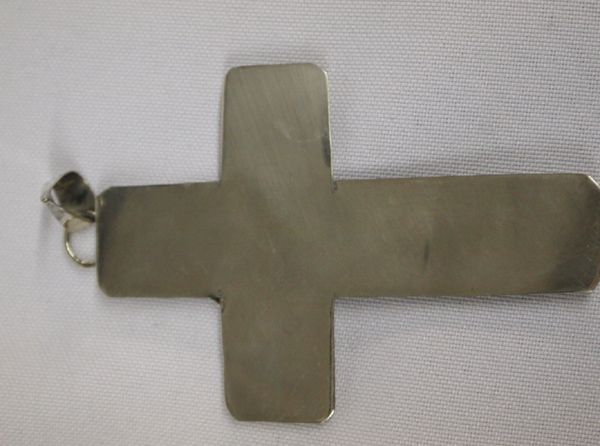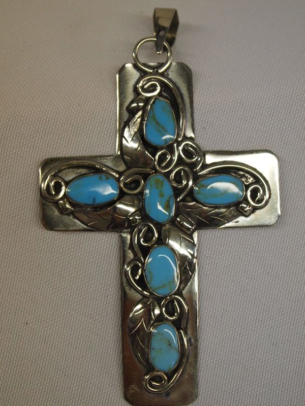 Navajo German Silver Turquoise Cross, 6 bright blue cabochons (.5'' x .25'') with golden brown matrix, traditional style leaves and scrollwork, 3.5''H x 2.25''W, dynamic cross