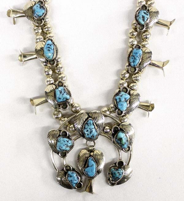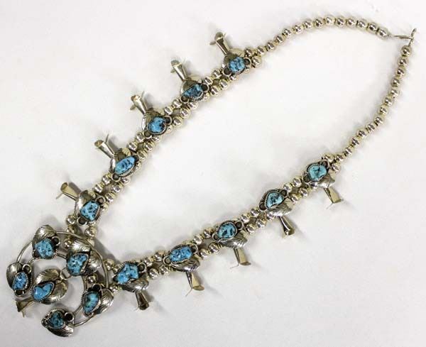 Estate Native American Navajo German Silver Morenci Turquoise Squash Blossom Necklace, measures 22''L end to end, naja measures 2.5''L x 2.5''W, over 100g in total wt.
