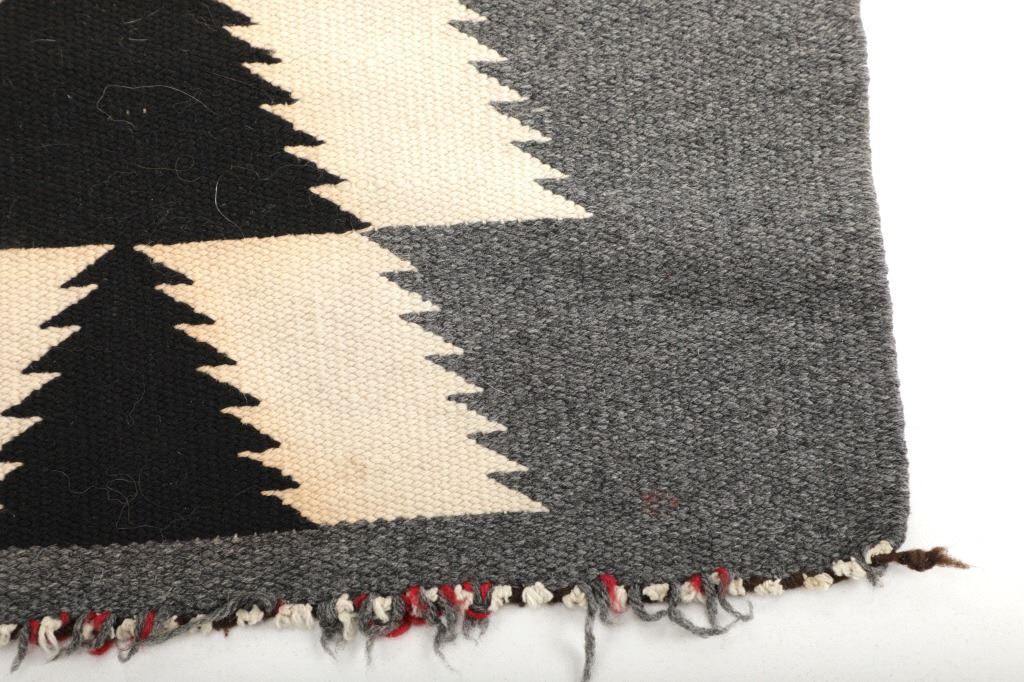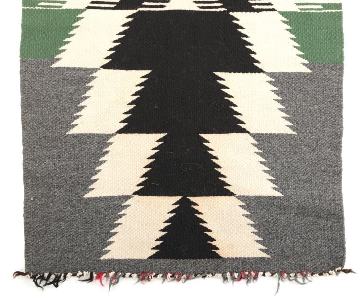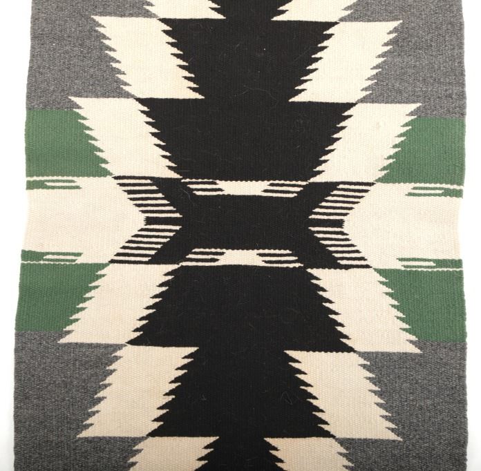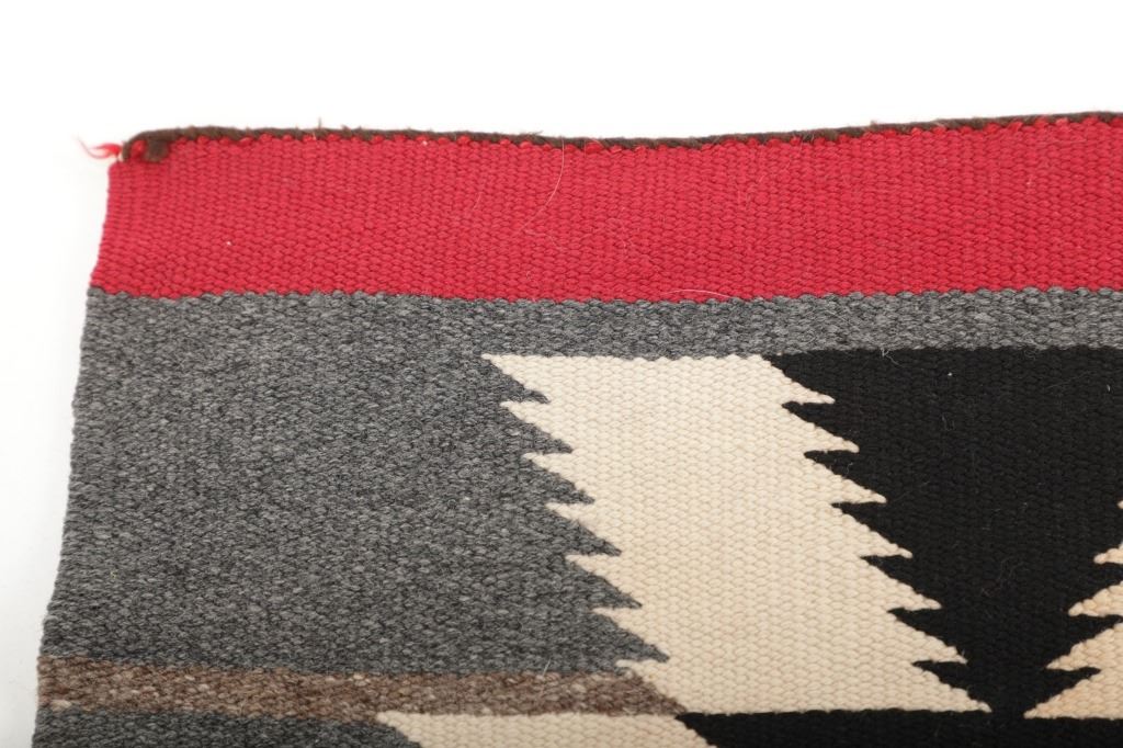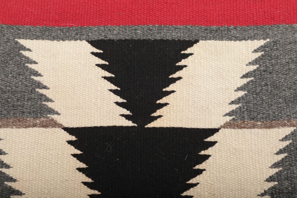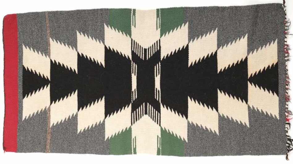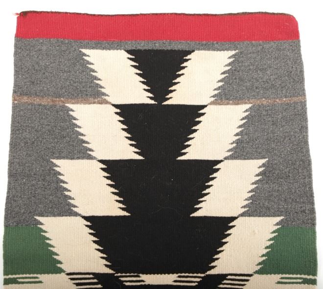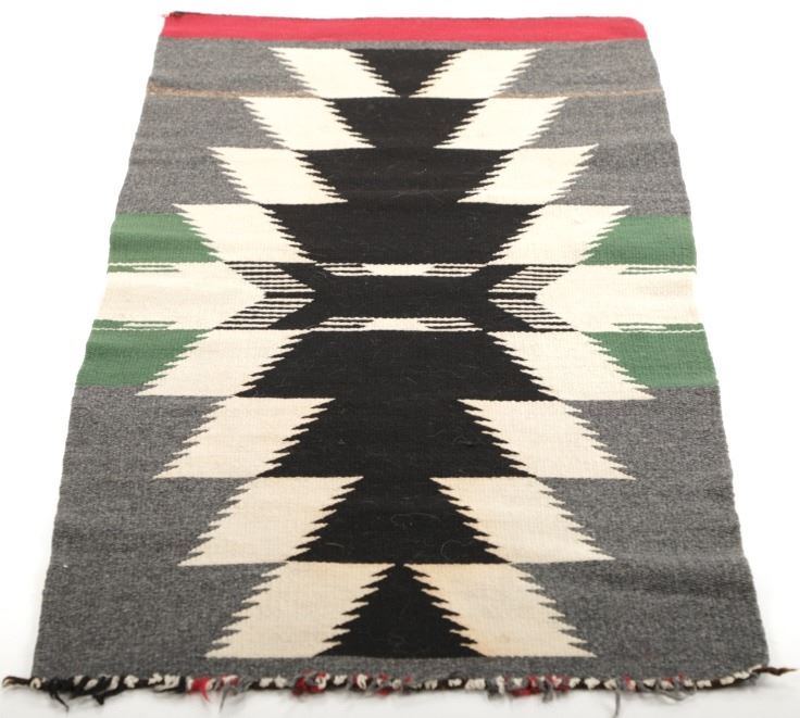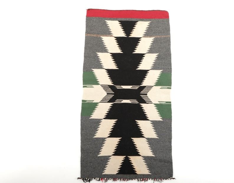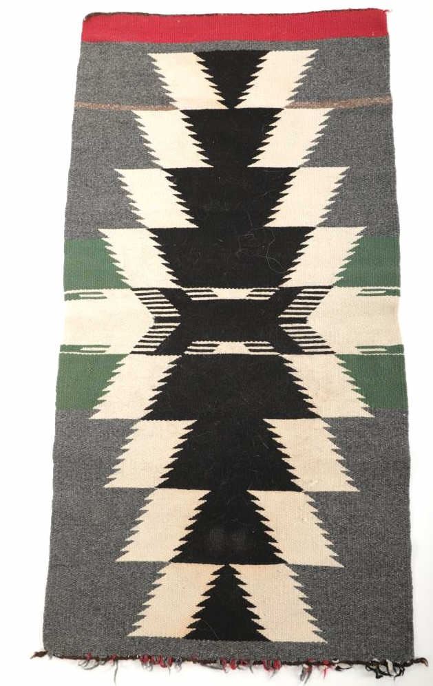 Featured in this lot is this Navajo Germantown Gallup Trading Post circa 1940's. The rug features a beautiful Germantown construction that features a stepped decoration throughout the central portion of the rug that shows a heathered grey field that shows a medium red border to the ends of the rug that shows a off white and black coloration to the stepped medallion with a band of light brown towards one side of the rug. The rug features a traditional Gallup decoration with one end of fringe. Gallup Throws are small vintage Navajo weavings, made during the first decades of the 20th century by Navajo weavers located near railroad stops and tourist centers. These weavings were too small to be used as rugs, instead intended as tabletop mats or wall hangings. The thread count of this rug is 154 threads per square inch. The condition of this Navajo Germantown rug is good with two of the tassels shown missing but otherwise shows good overall condition. The measurements of this rug is 33" x 16 3/4". Provenance: From the renowned Sundog Fine Art Bozeman, Montana collection and collected by Bruce VanLandingham. Bruce VanLandingham was a pillar in the American Indian collecting community and a respected expert. Along with being an avid collector, Bruce also was the sole owner of Sundog Fine Art Gallery in Bozeman, which was both part museum and gallery.