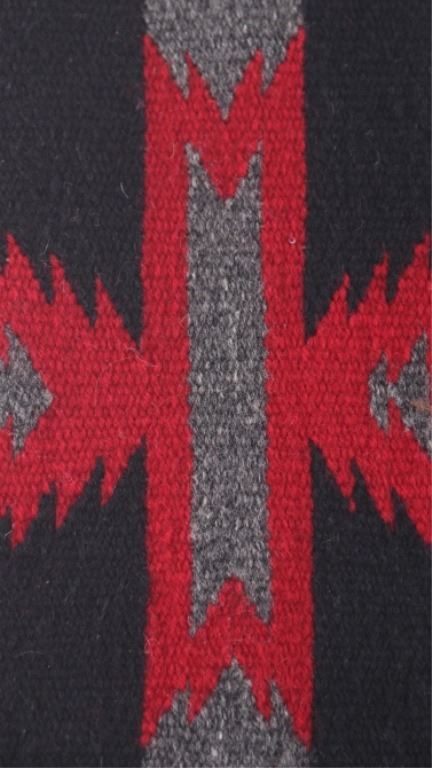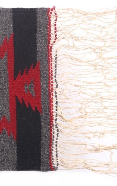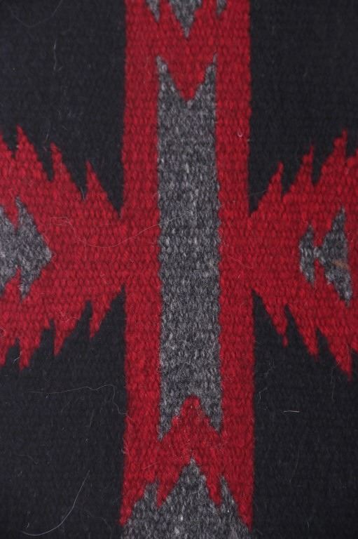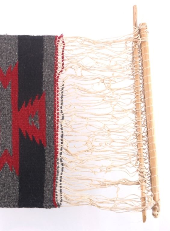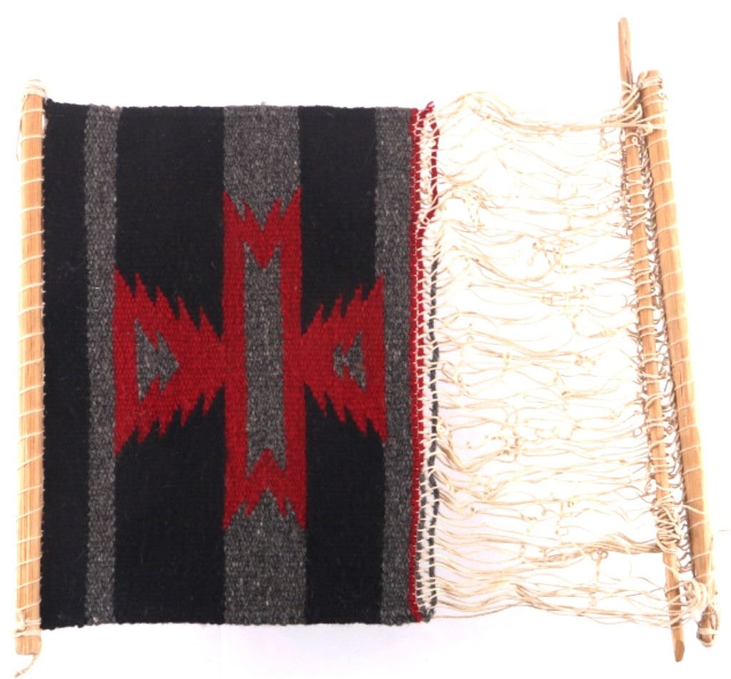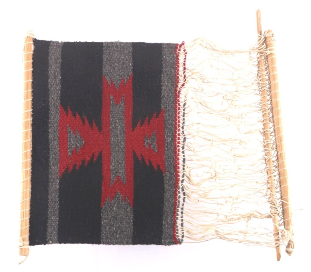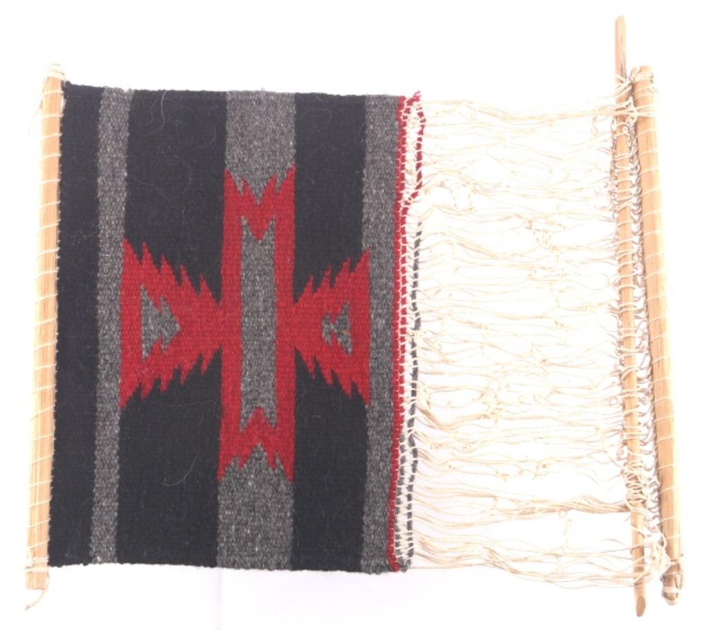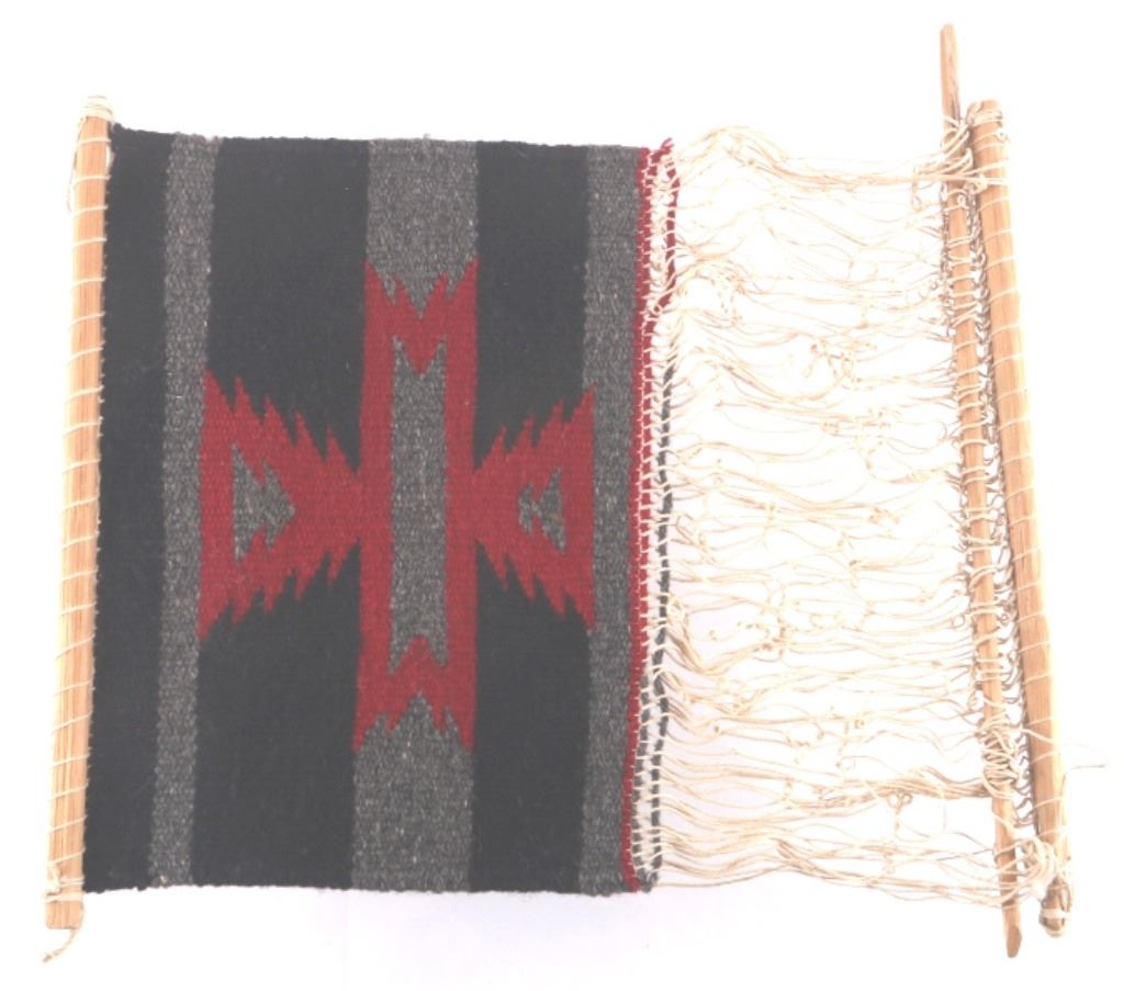 Featured in this lot is this Navajo Germantown medallion sampler circa 1910-1920. The sampler shows wonderfully and professionally crafted design with the rug still on the loom. The rug shows traditional Germantown design with a stepped red medallion shown on a field of bands of black and grey. The condition of this sampler is good with the top layer of the weave shown loose but otherwise in good overall condition. The measurements of this sampler on its loom are 14 1/4" x 12 1/4". Provenance: From the renowned Sundog Fine Art Bozeman, Montana collection and collected by Bruce VanLandingham. Bruce VanLandingham was a pillar in the American Indian collecting community and a respected expert. Along with being an avid collector, Bruce also was the sole owner of Sundog Fine Art Gallery in Bozeman, which was both part museum and gallery. Identification#: E1113.