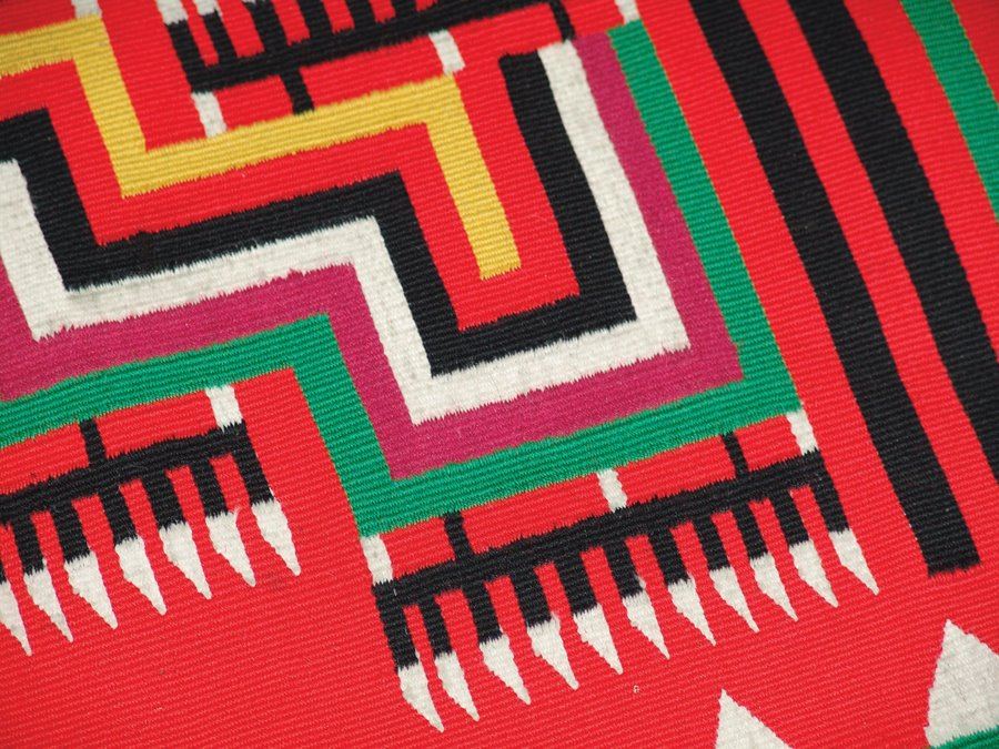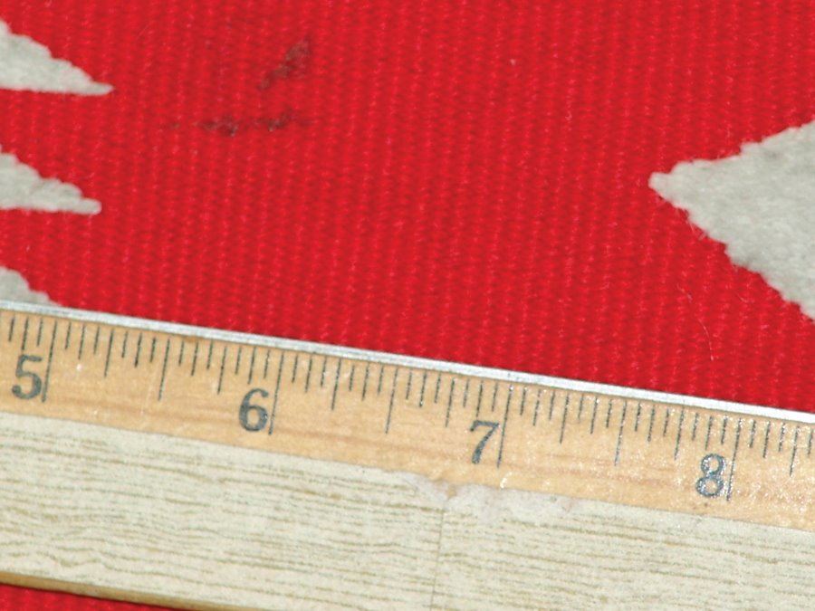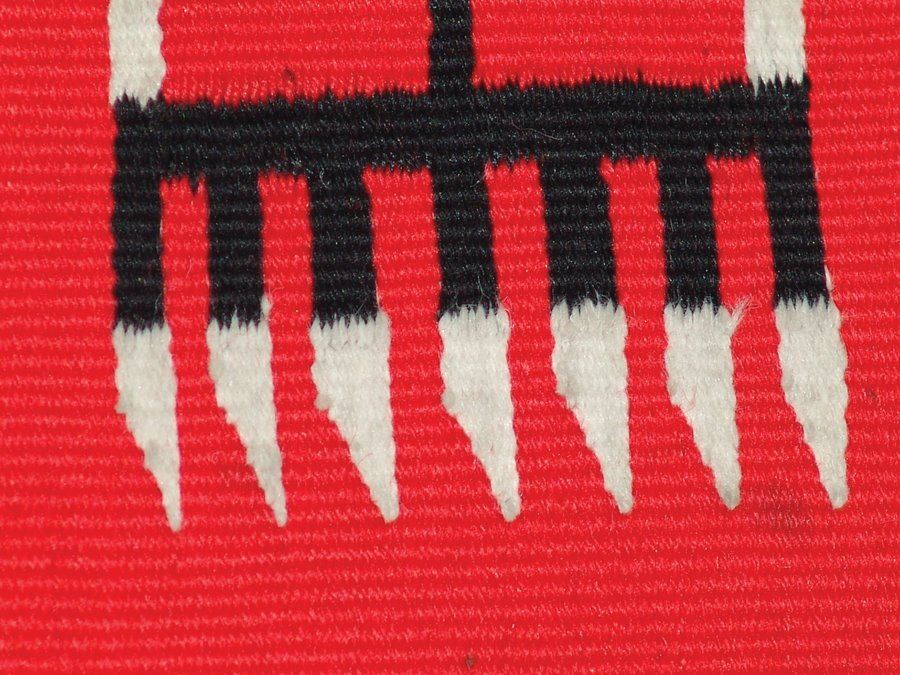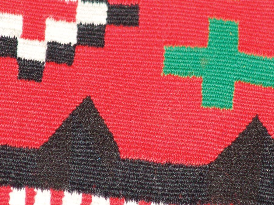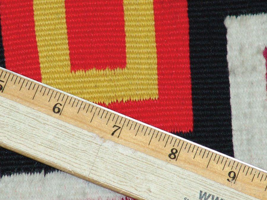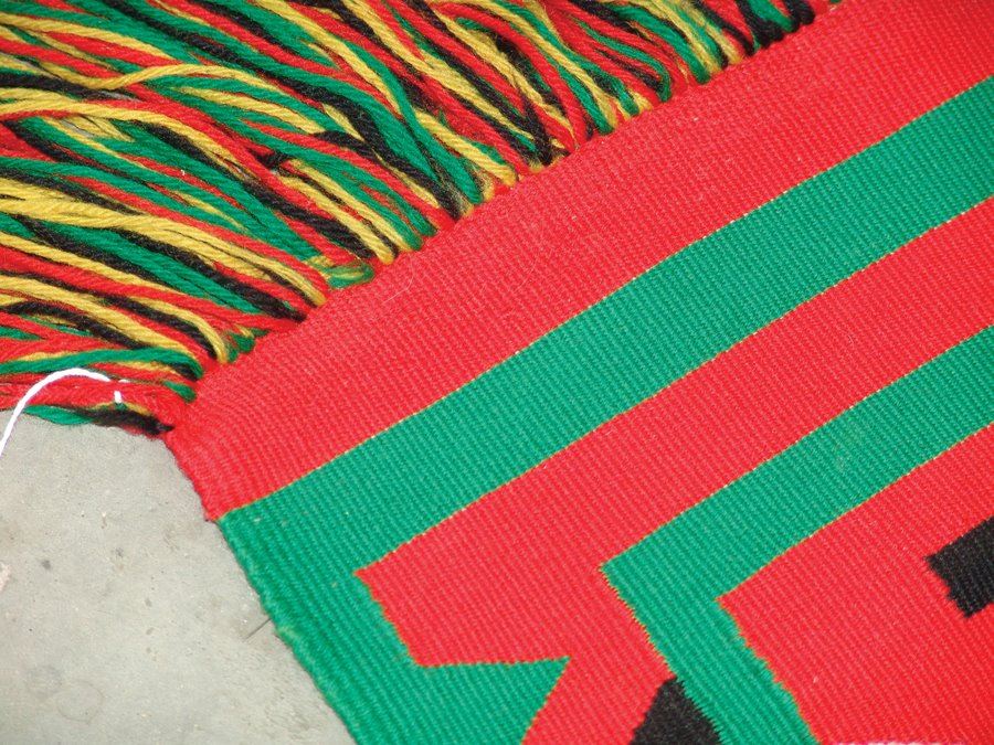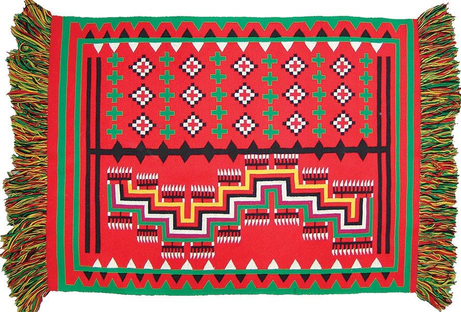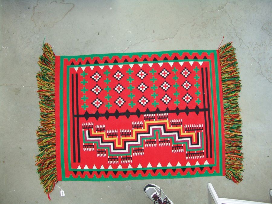 Amazing, extra fine weave Germantown revival wearing blanket with non-symmetrical design and colorful fringed edges, and done in red, green, black, yellow, white, and cherry. Very good condition. An amazing museum quality,,,53" x 40" plus fringe