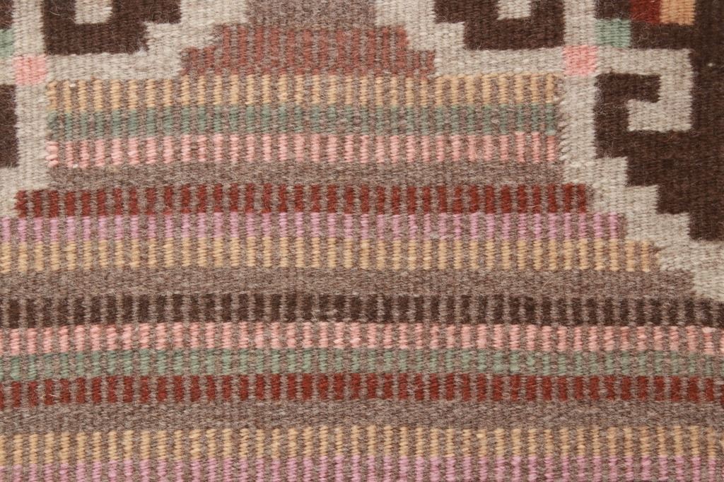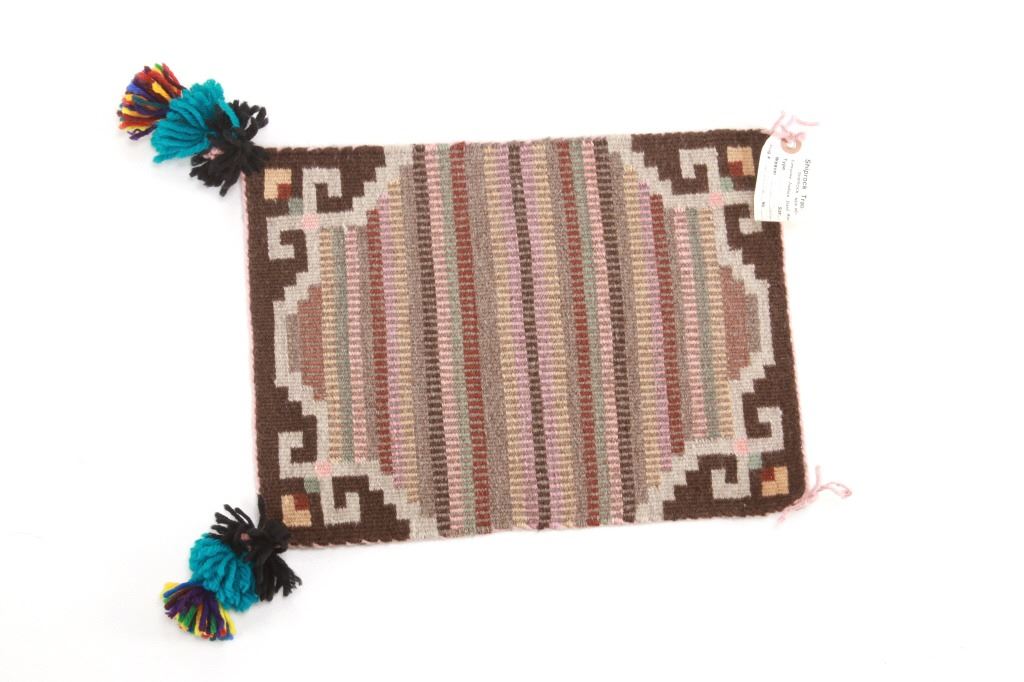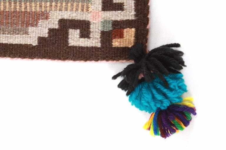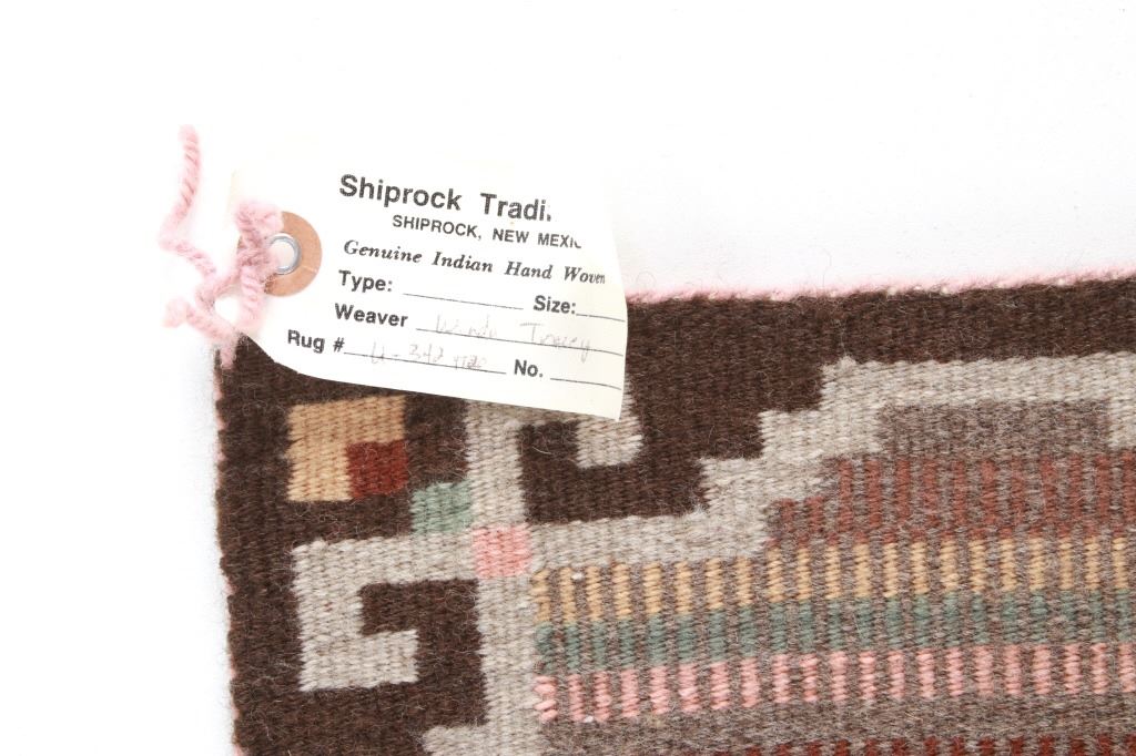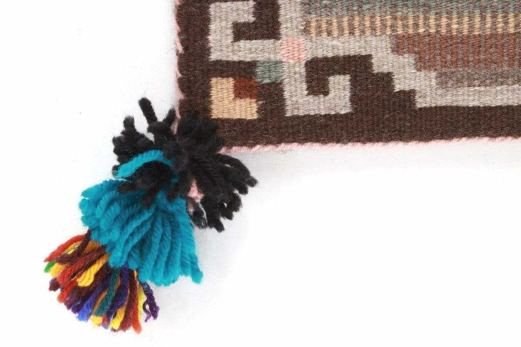 Featured in this lot is this Navajo Germantown Ship Rock Trading Post sampler rug. The rug features a a wonderfully and professionally crafted tight woven wool construciton that shows a beautiful example of Germantown design that includes coloration of light grey, brown, turquoise, and maroon red colors and features very unique tassels on one end that shows a layered design and a multi color tip. The condition of this rug is good with no obvious signs of damage and in good overall condition. The measurements of this sampler rug are 14 1/4" x 10 1/4". Weave count: 27 x 11 and 297 counted by square inch. The rug also features the original Ship Rock Trading Post
