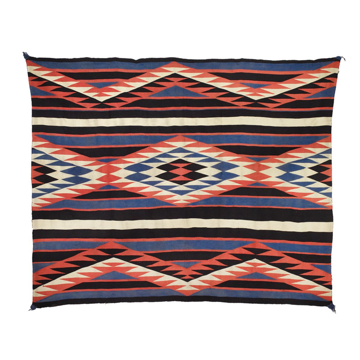63” x 77” horizontal bands of serrated diamonds and half diamonds in red, blue, white and black with alternating solid stripes of black and white. The red appears to be raveled yarn. Fine condition, c 1900