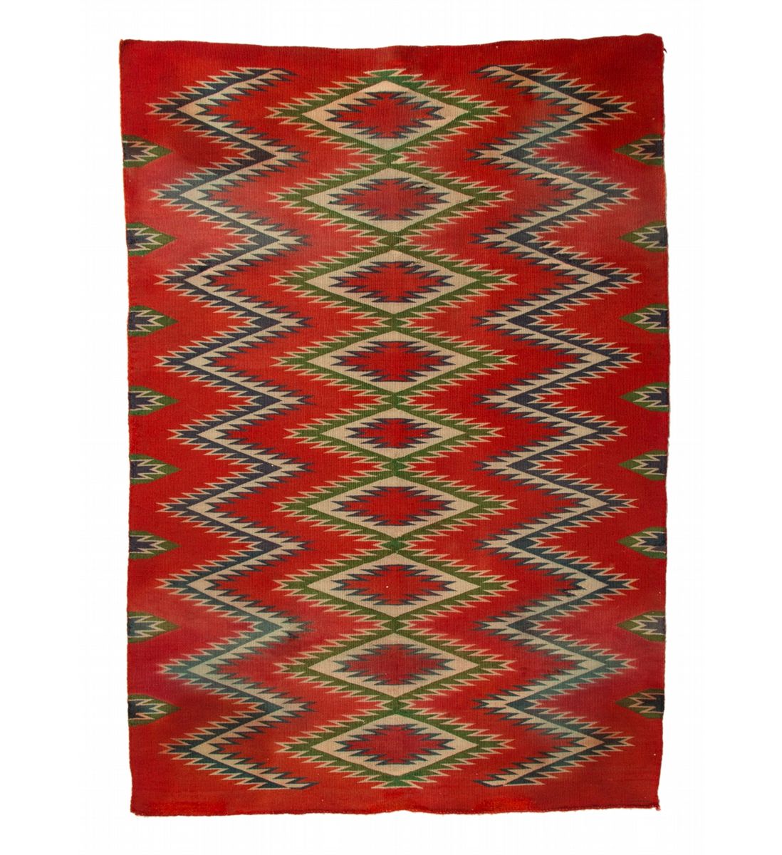 Navajo Germantown Weaving. 3'10" x 2'8". Red background with green, white and blue design elements in eye dazzler pattern. Circa 1890s.