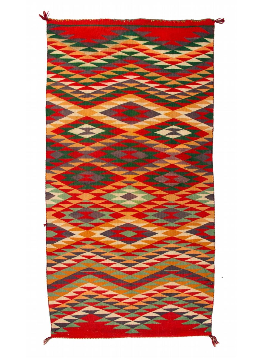Navajo Germantown Weaving. 4' x 2'1". Classic eye dazzler designs with a red background. Multicolored with at least seven different colors. Circa 1890s.
