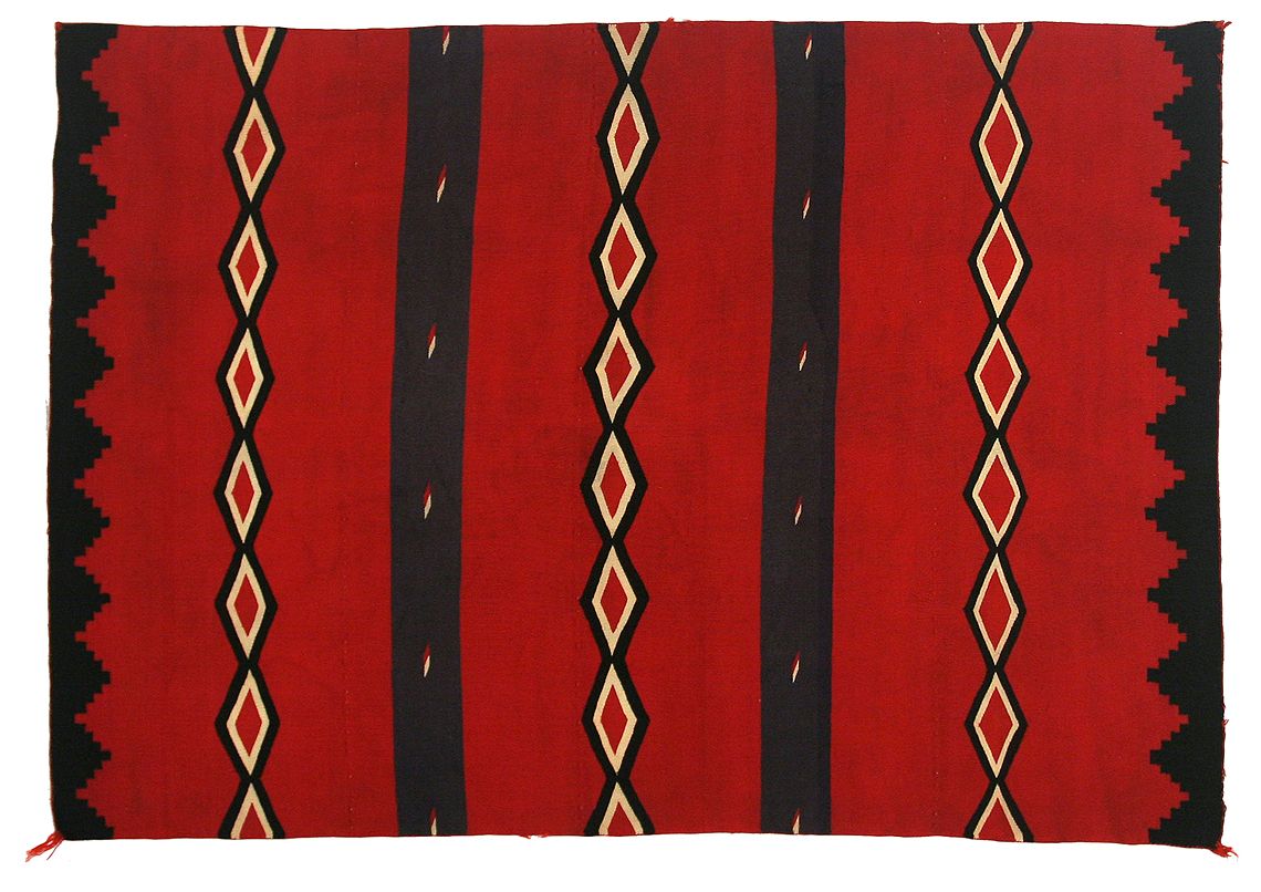 Navajo Germantown Weaving. 6'7" x 4'8" with bands of diamonds & indigo stripes on a solid red background. Black stepped edges. Circa 1890s. (est. $4,000-6,000). CONDITION REPORTS: www.auctioninsantafe.com/docs/cr2012.pdf