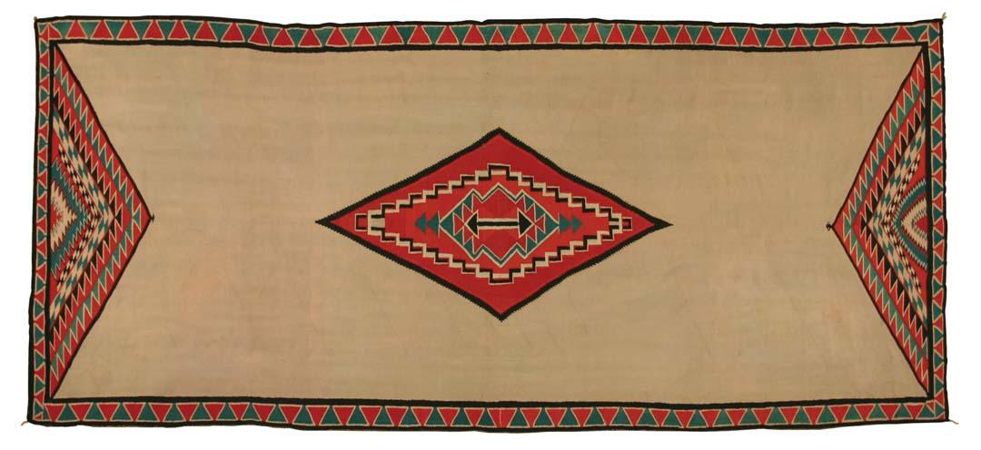 Navajo Weaving. 109" x 49". Germantown Area. Monochrome field with floating diamond elements at the center & ends. Saltillo influence. Circa 1890. (est $10,000-15,000). For condition reports please visit: www.auctioninsantafe.com/cr2011.pdf