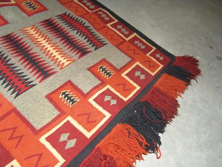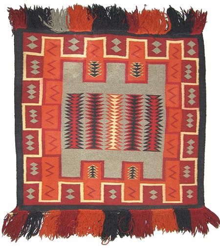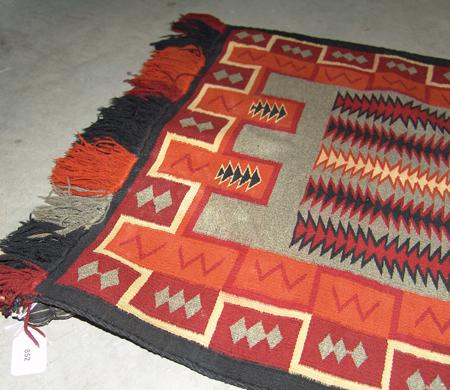 Very fine weave with fringed ends and intricate outlined designs. Condition: very good. 24" x 22"