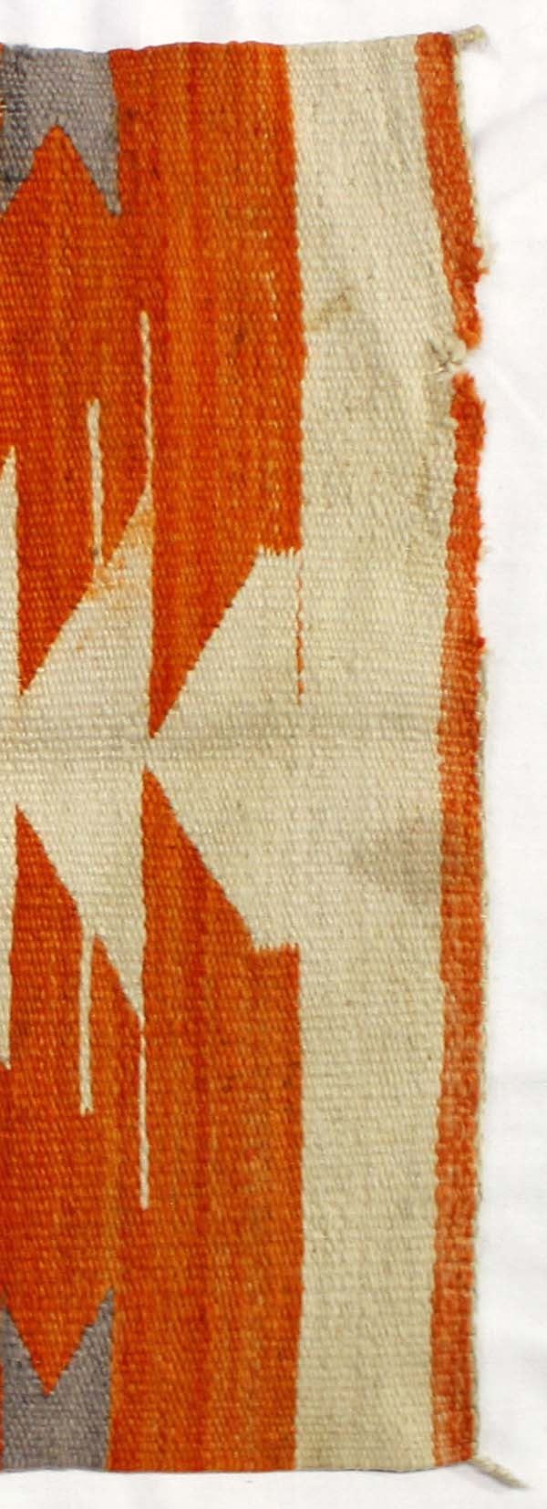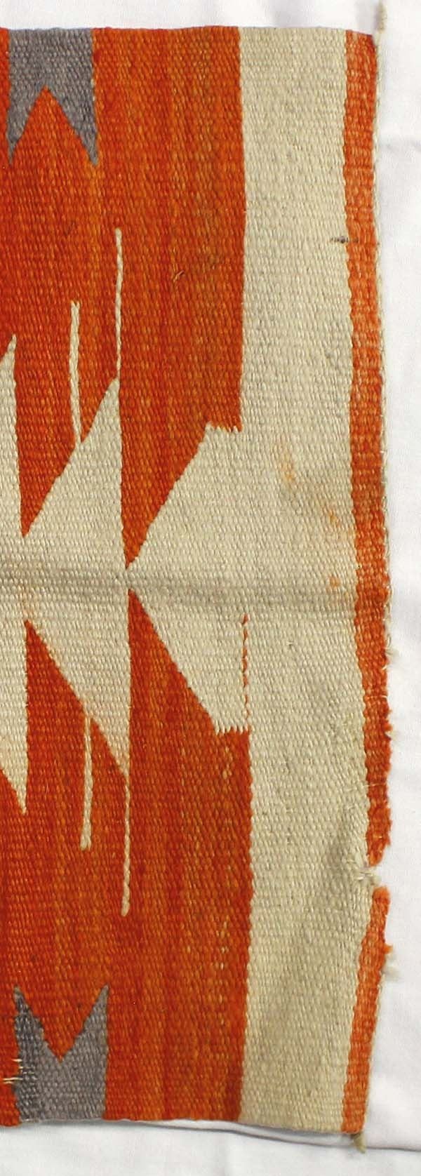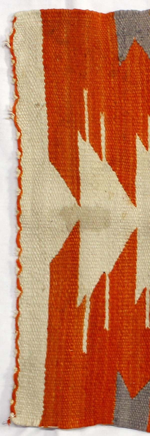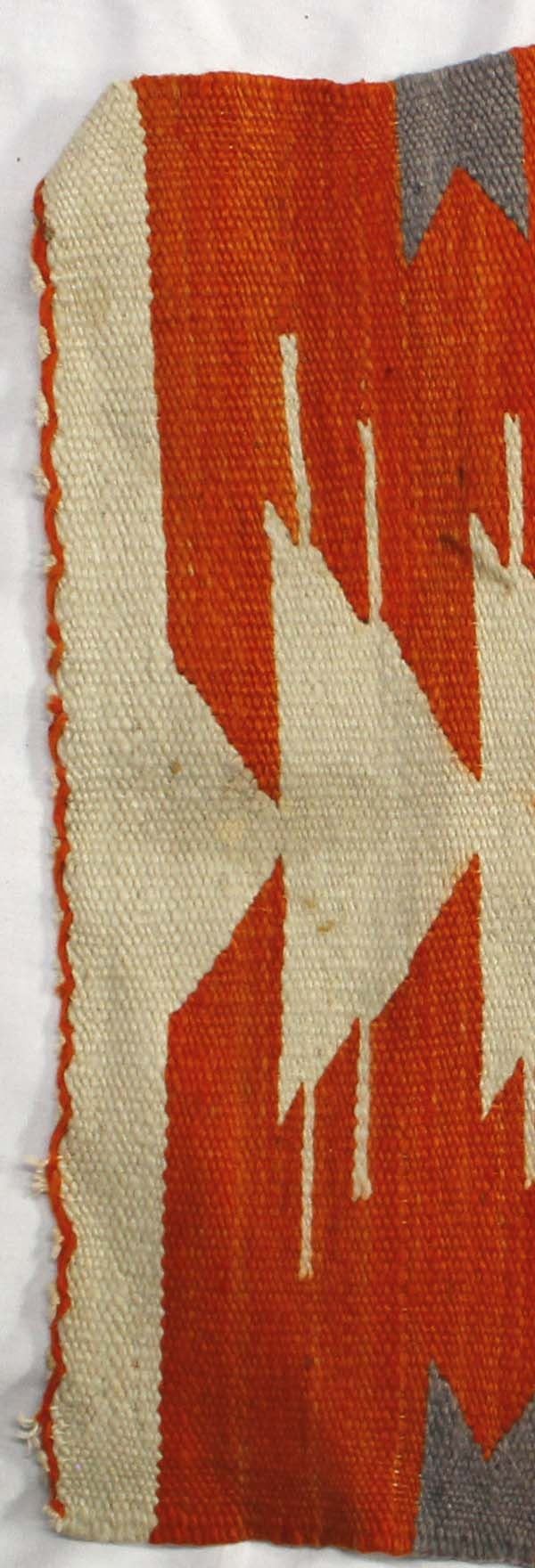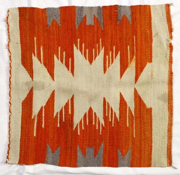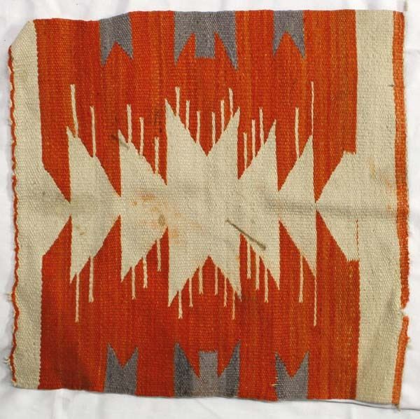 Navajo Germantown Wool Textile Rug, some stains, measures 22'' x 21'', selvage damage on one end, 2 tassels intact on one end, enclosed stitching on the other