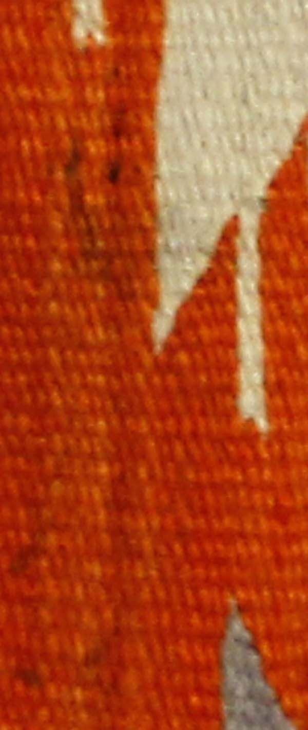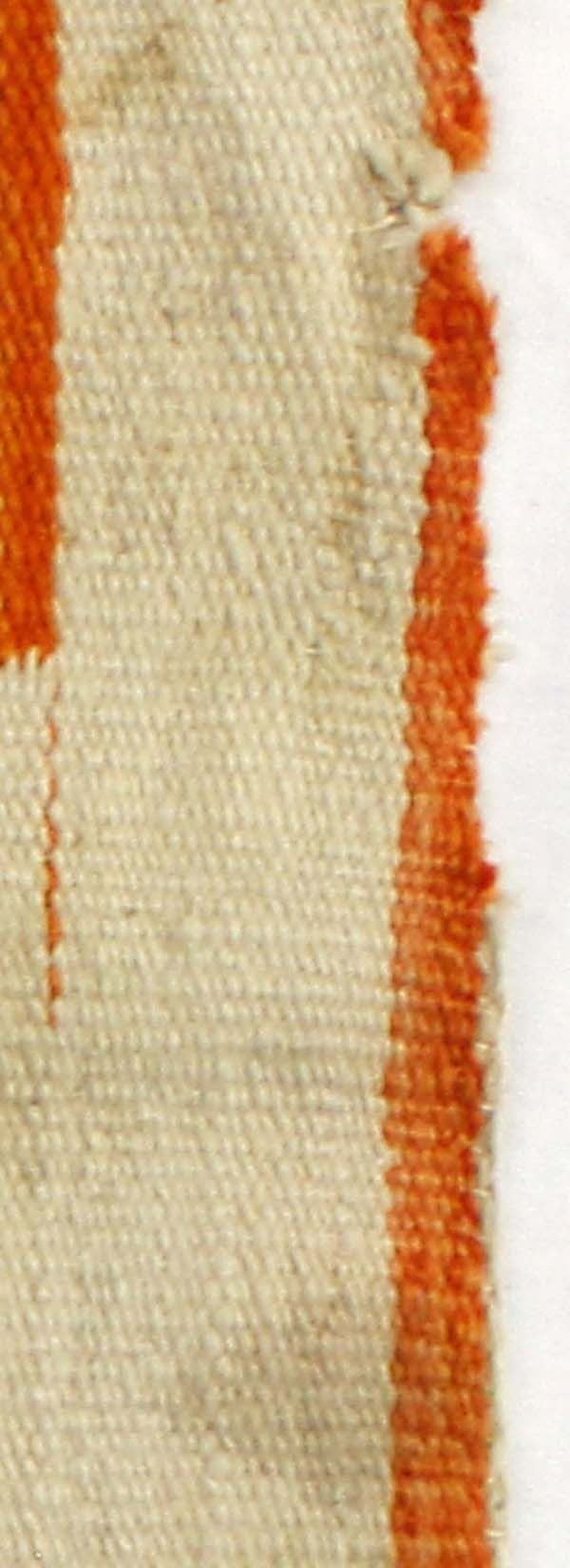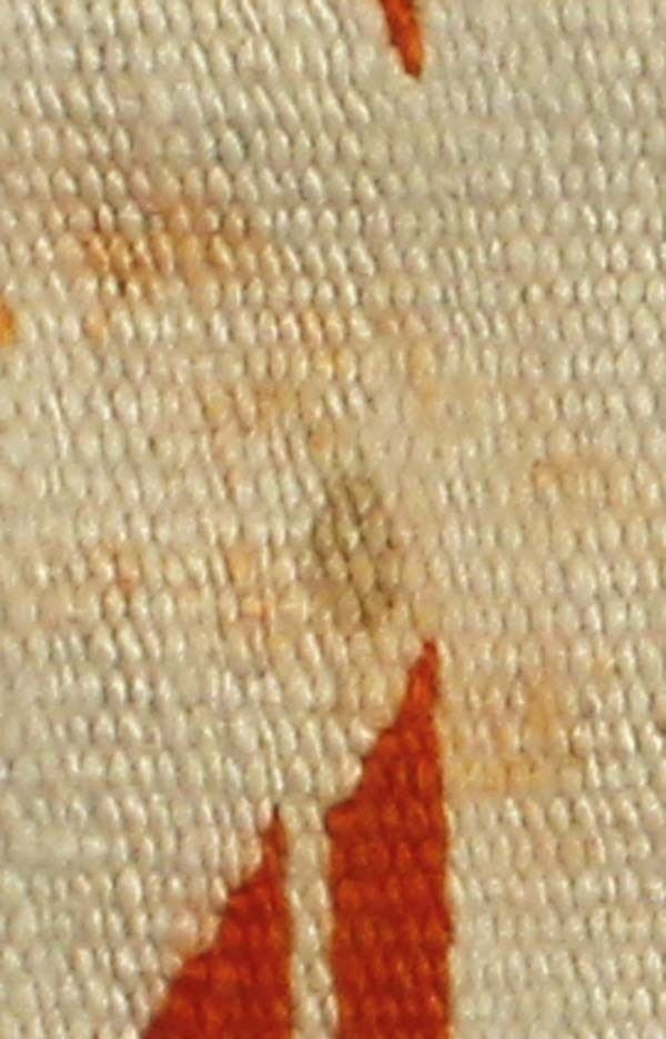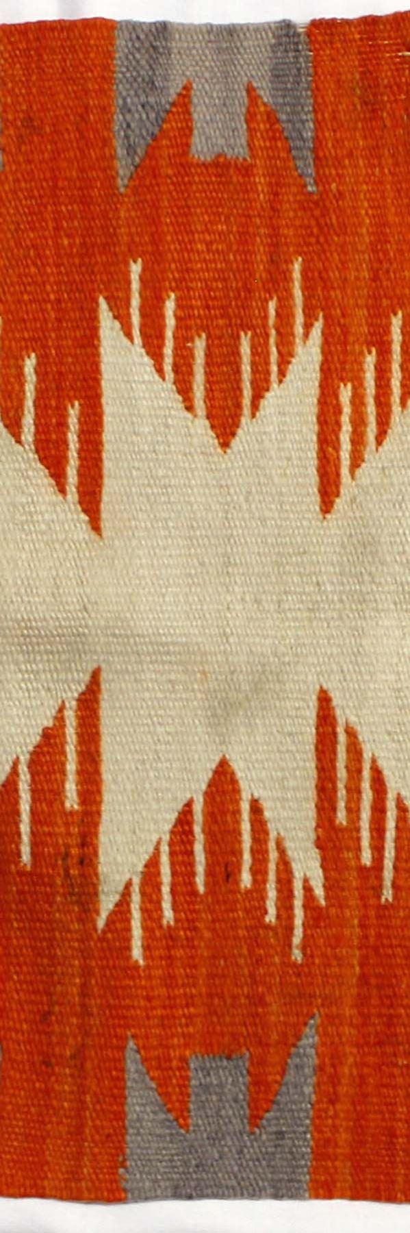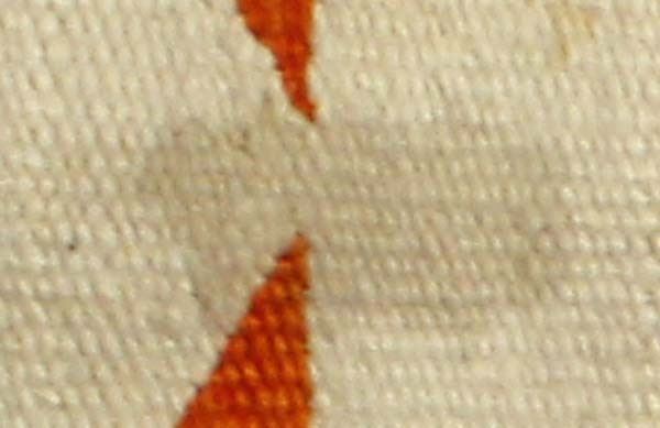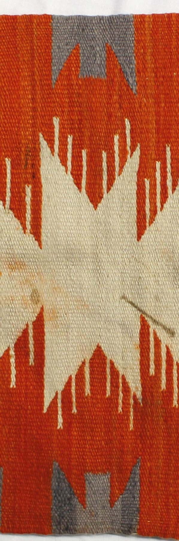 Navajo Germantown Wool Textile Rug, some stains, measures 22'' x 21'', selvage damage on one end, 2 tassels intact on one end, enclosed stitching on the other