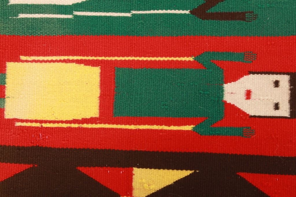 Featured in this lot is this Navajo Germantown Yei-Bi-Chei rug circa 1900. The rug features a traditional Germantown design with geometric patterns on either side of the center piece, and the center piece features three Yei Bi Chei figurals with stalks hanging from their elbows. Yei bichei, or "maternal grandfather of the yei", is another name of Talking God who often speaks on behalf of the other Holy People. The colors on this rug are green, brown, red and yellow with some off white coloration. The condition of this rug is good with a tightly woven weave and in good overall condition. The measurements of this rug are 34" x 17". Provenance: From the renowned Sundog Fine Art Bozeman, Montana collection and collected by Bruce VanLandingham. Bruce VanLandingham was a pillar in the American Indian collecting community and a respected expert. Along with being an avid collector, Bruce also was the sole owner of Sundog Fine Art Gallery in Bozeman, which was both part museum and gallery. Identification#: E1111