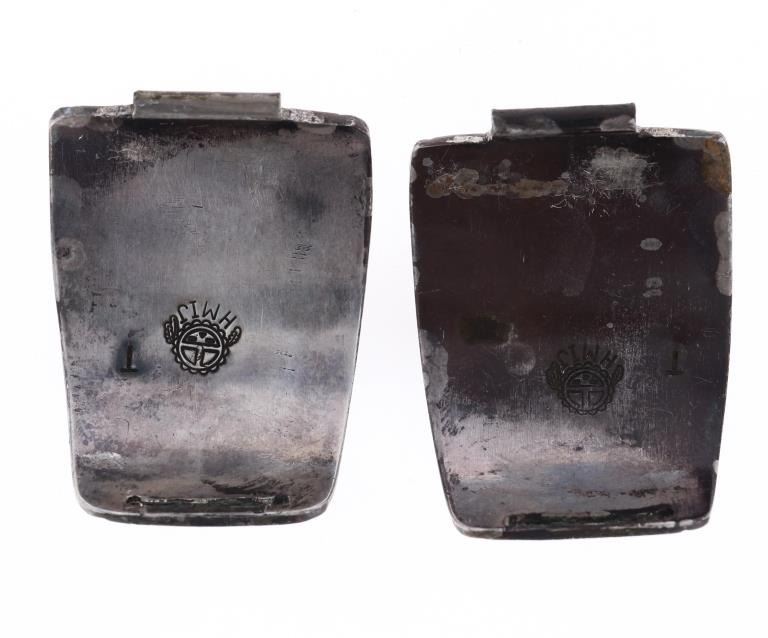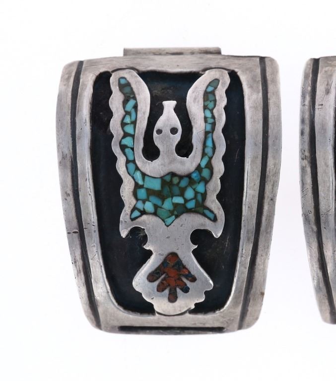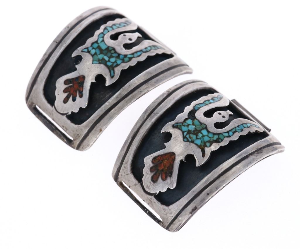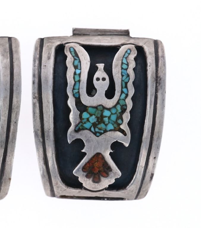 Featured in this lot is this chipped inlay watchband tips from Navajo artist and gallery Gilbert Ortega. The watchband tips shows a wonderfully and professionally crafted sterling silver construction with a shadowbox design with a thunderbird central decoration with chipped turquoise and chipped red branch coral inlaid into the face of the tips. The condition of this of these watchband tips is fair with one segment of the chipped turquoise missing from the inlay but otherwise shows fair overall condition. The measurements of each of the watchband tip are 1 3/4" x 1 1/4" x 5/8". The collective weight of this watchband tips is 37.6g.