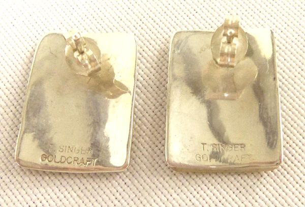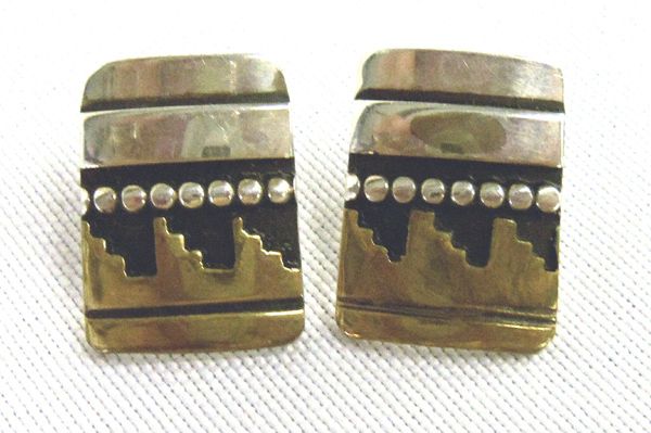 Native American Navajo Gold Overlay Pierced Earrings -Tommy Singer. 5/8''H x 1/2''. Overlay portrays the desert mountains. Overlay pieces are made of two layers. The bottom layer is a solid sterling silver piece. The top layer has a cutout design. The cutout is placed over the bottom layer and the two pieces are ''sweated'' together, that is heated so that they become one. The bottom layer (background to the cutout) is usually accented. The Navajo silversmiths oxidize the bottom layer which darkens it.