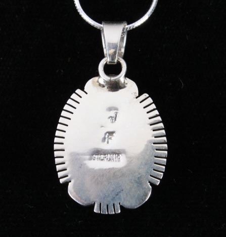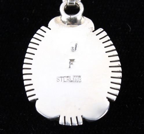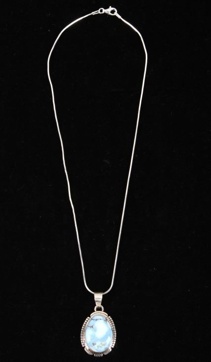 Included in this lot is a Navajo Native American Golden Hills turquoise and sterling silver necklace. This stunning necklace features a large polished cabochon of Golden Hills turquoise. The gemstone is expertly set in a shadow box with hand stamped border. The back of the pendant is stamped with the artist Jerold Francisco’s hallmark “JF” and also marked “Sterling”. The necklace features a sterling silver box chain that measures 16” when unclasped.