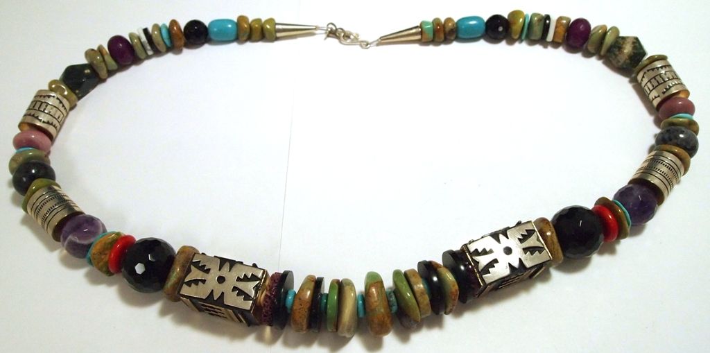 Measures 26" around by from 3/8" to 3/4" wide. Stones present: Green Mountain Turquoise, 12k Gold Fill & Sterling Silver beads, Onyx, Turquoise, Coral, Spiny Oyster, Marble, Howlite, Glass.