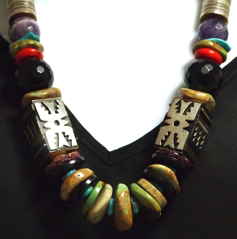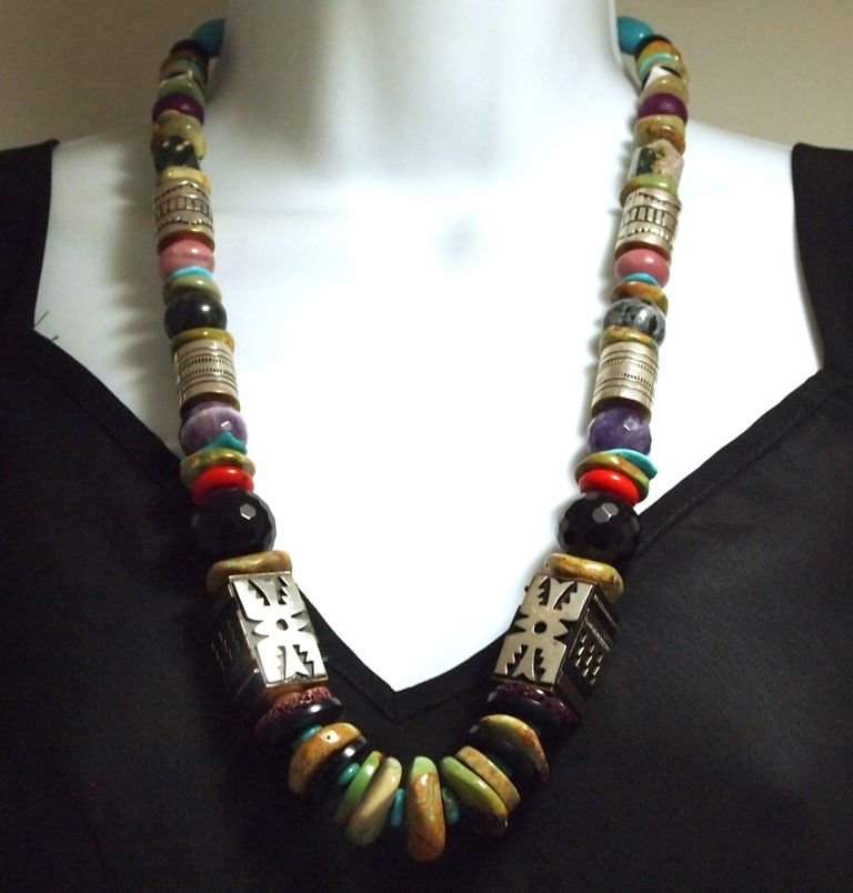 Measures 26" around by from 3/8" to 3/4" wide. Stones present: Green Mountain Turquoise, 12k Gold Fill & Sterling Silver beads, Onyx, Turquoise, Coral, Spiny Oyster, Marble, Howlite, Glass.