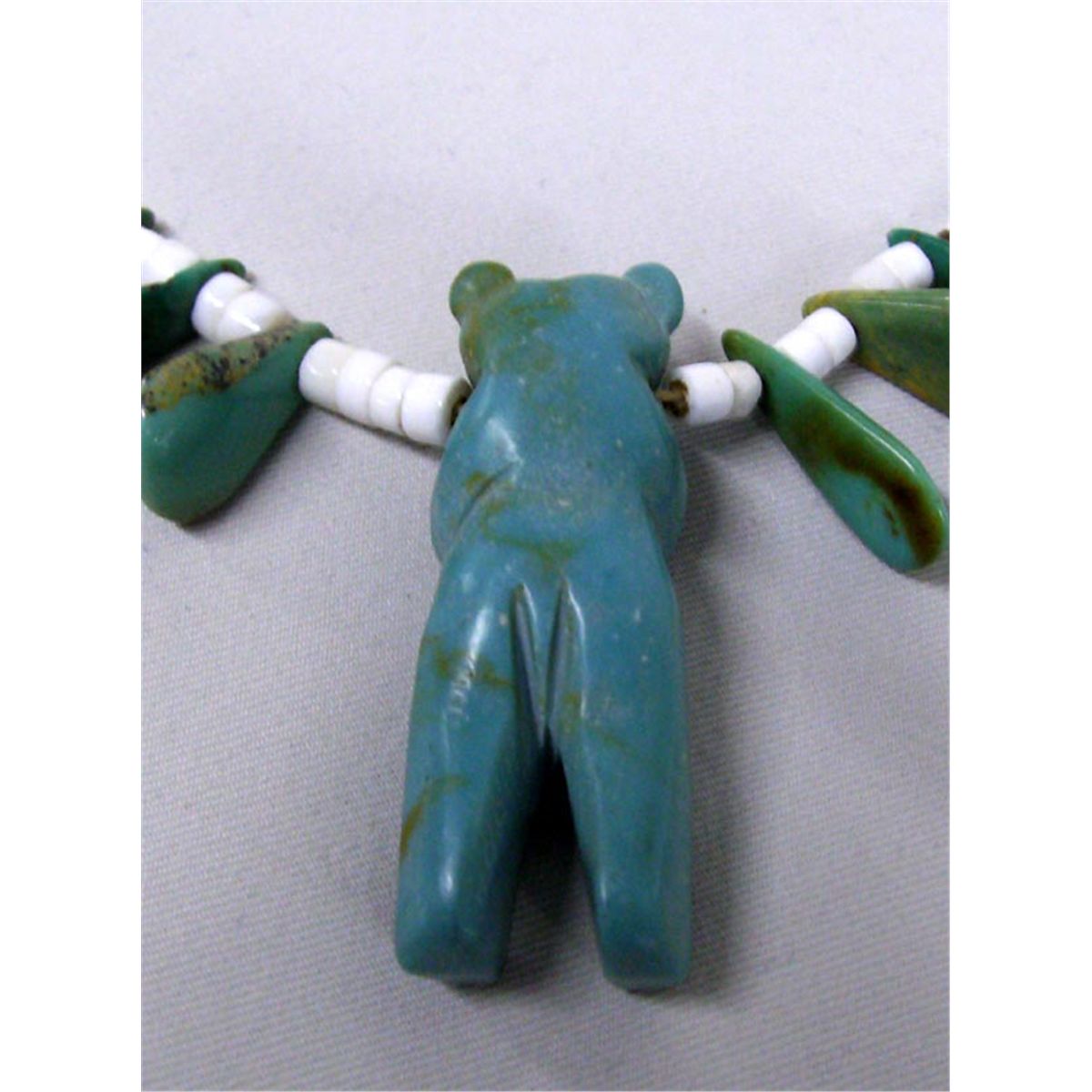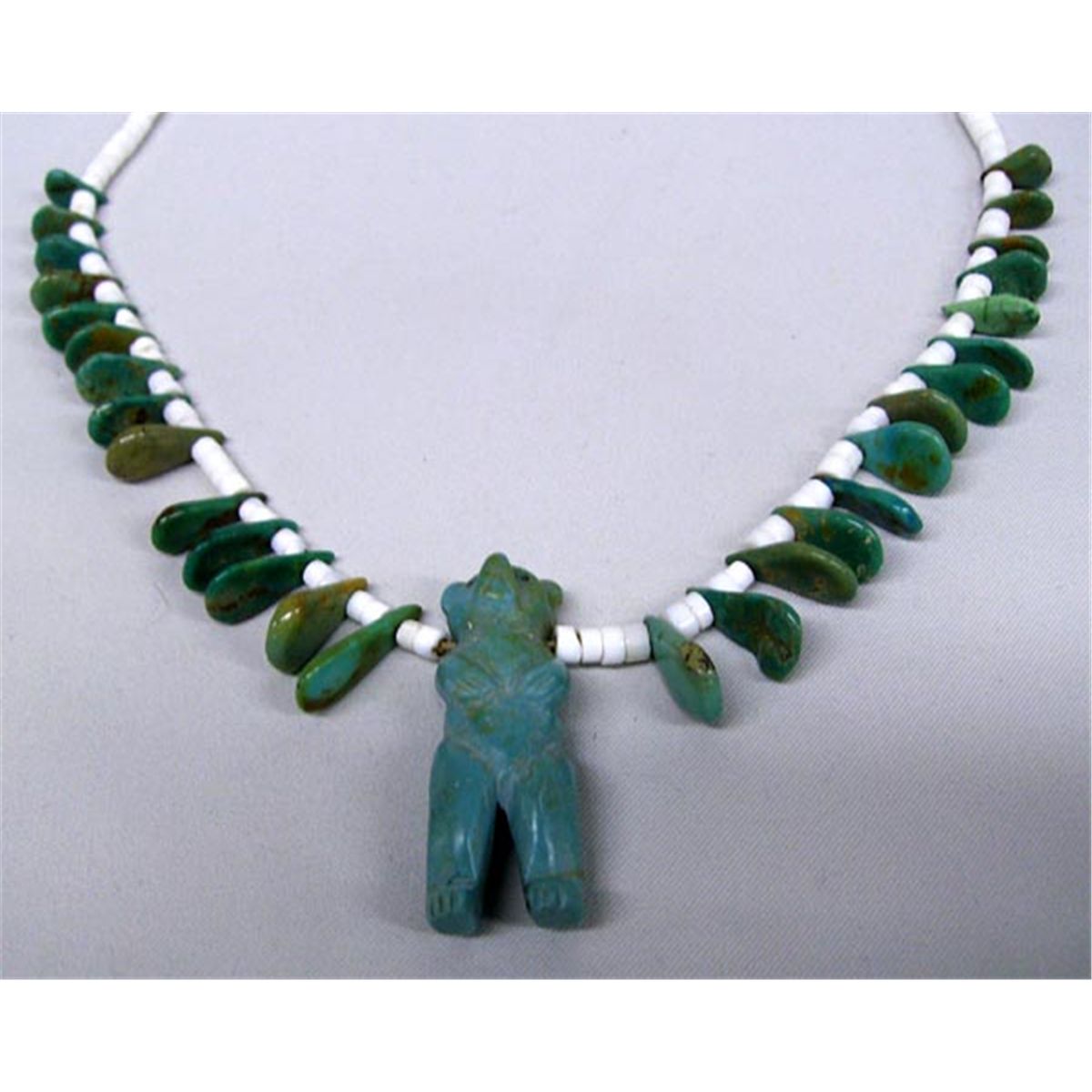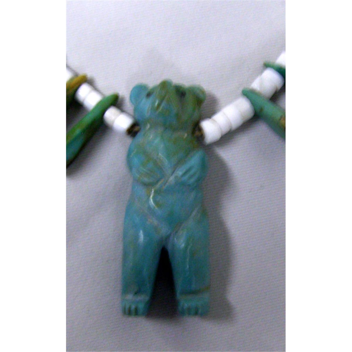 Native American Navajo Bear Fetish Necklace, Green Turquoise. Measures 24'', carved bear fetish measures 2'' in length. Nevada green turquoise tear-drop beads with shell heishi beads. Buyers Pay Actual Shipping and Handling Charges(see terms and conditions for more information).