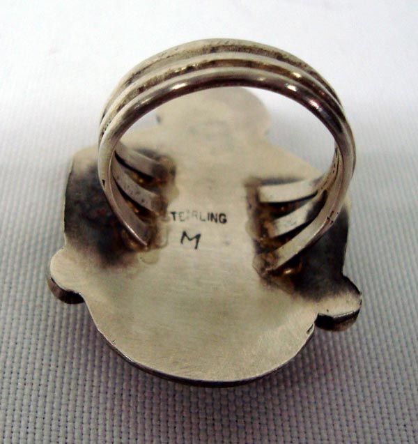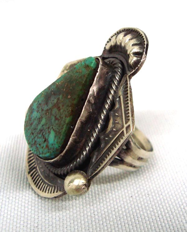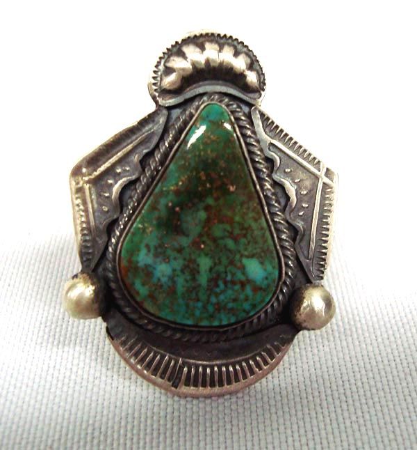 Native American Navajo Green Turquoise Sterling Ring - Martinez. Gorgeous green turquoise tear drop nugget with lots of copper matrix set in an unusual sterling setting. Stamped on the back, ''Sterling'' and ''M'' for Jesse Martinez. Size 8.5. Setting measures 1.5''x1.25''.