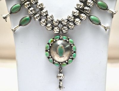 Navajo Green Turquoise Sterling Silver Squash Blossom Necklace & Earrings Set - L.F.K.