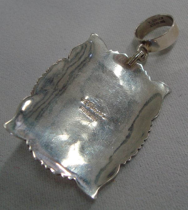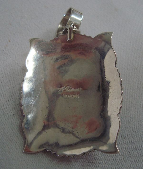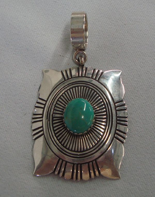 Navajo Green Turquoise Cabochon on Sterling Pendant-Singer. Gorgeous and styled by one of the best silversmiths, Tommy Singer, this piece is 2.5''H with bale, 1.25''W. Jeweler Thomas Singer is a Navajo Indian from Winslow, Arizona. Tommy Singer states, ''Every piece is made with the meanings from my traditional ways - the Navajo way of living.''