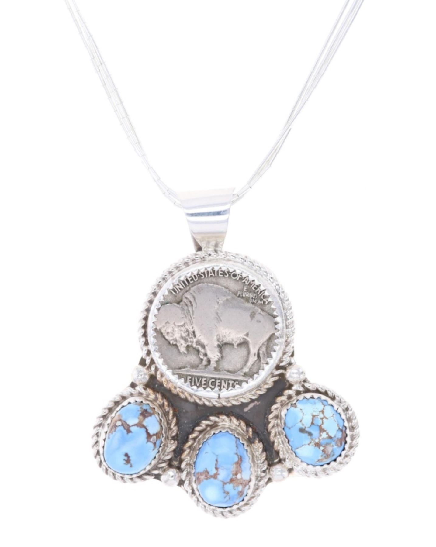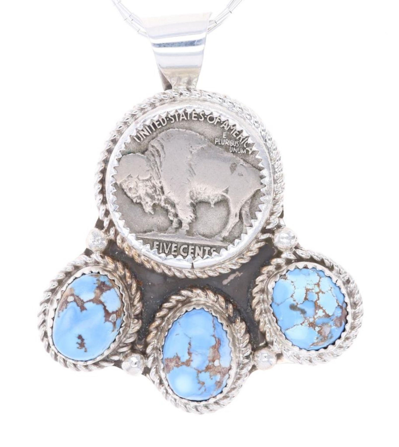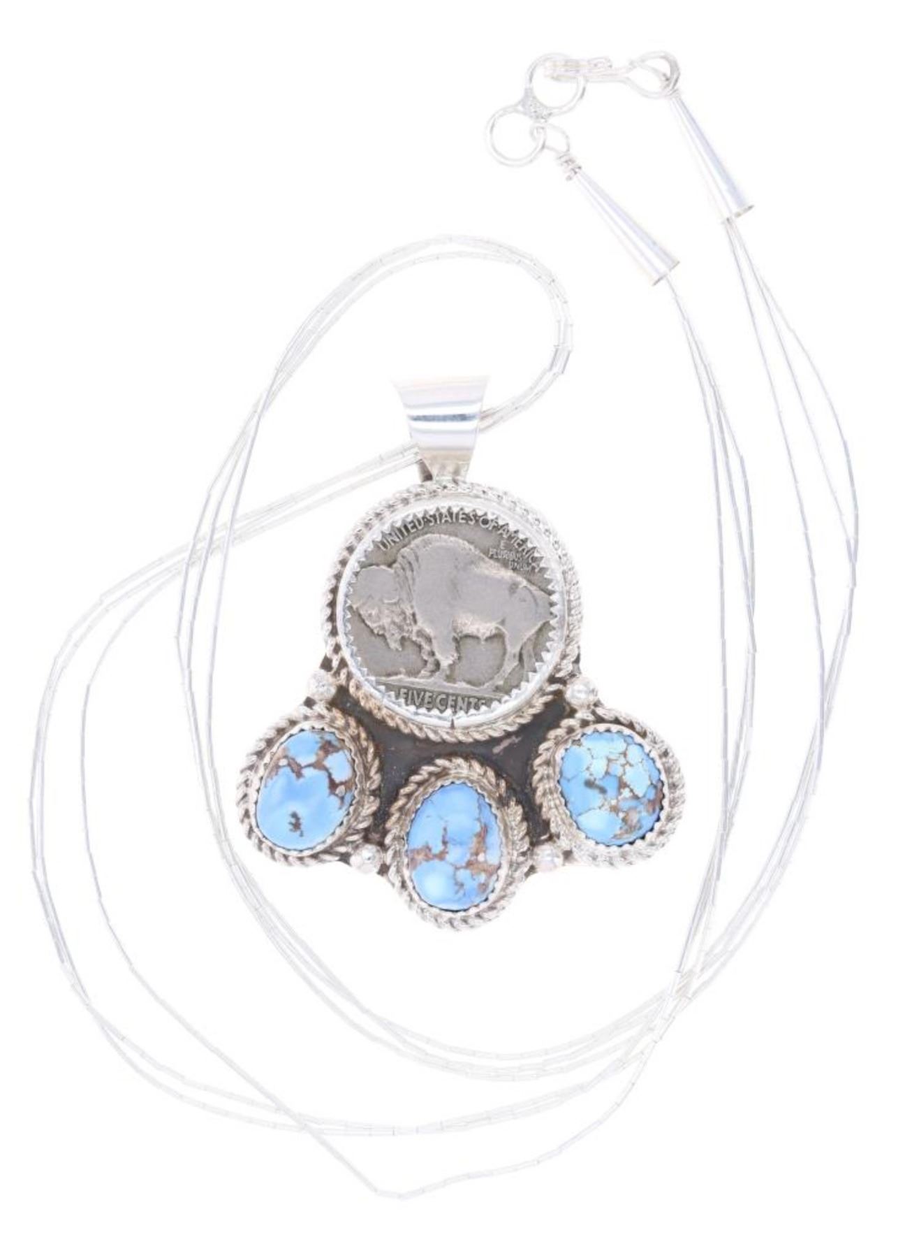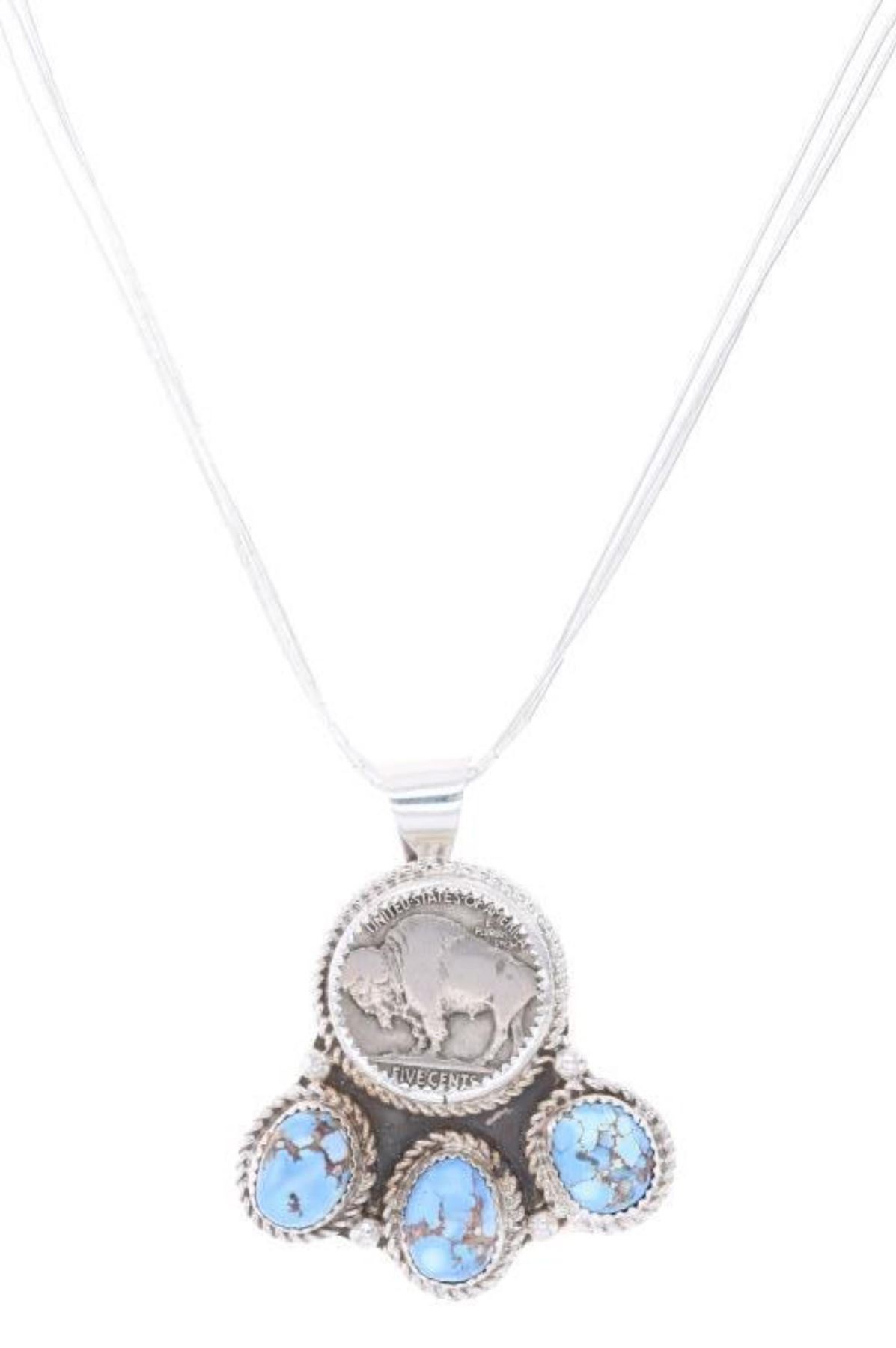 Featured in this lot is this sterling silver and Golden Hills Turquoise necklace from Navajo artist Herbert Tsosie. The necklace features a wonderfully and professionally crafted sterling silver and Golden Hills Turquoise construction that shows a triple strand necklace chain with a buffalo nickel in the center and three oval cut Golden Hills Turquoise cabochon set in the center. The necklace is marked on the back of the pendant as follows: HT - Sterling. The condition of this Navajo necklace is good with no obvious signs of damage and shows good overall condition. The measurements of this necklace from clasp to clasp is 19 1/2" and the pendant measures 2 1/8" x 1 3/4". The collective weight of this necklace is 22.6g.